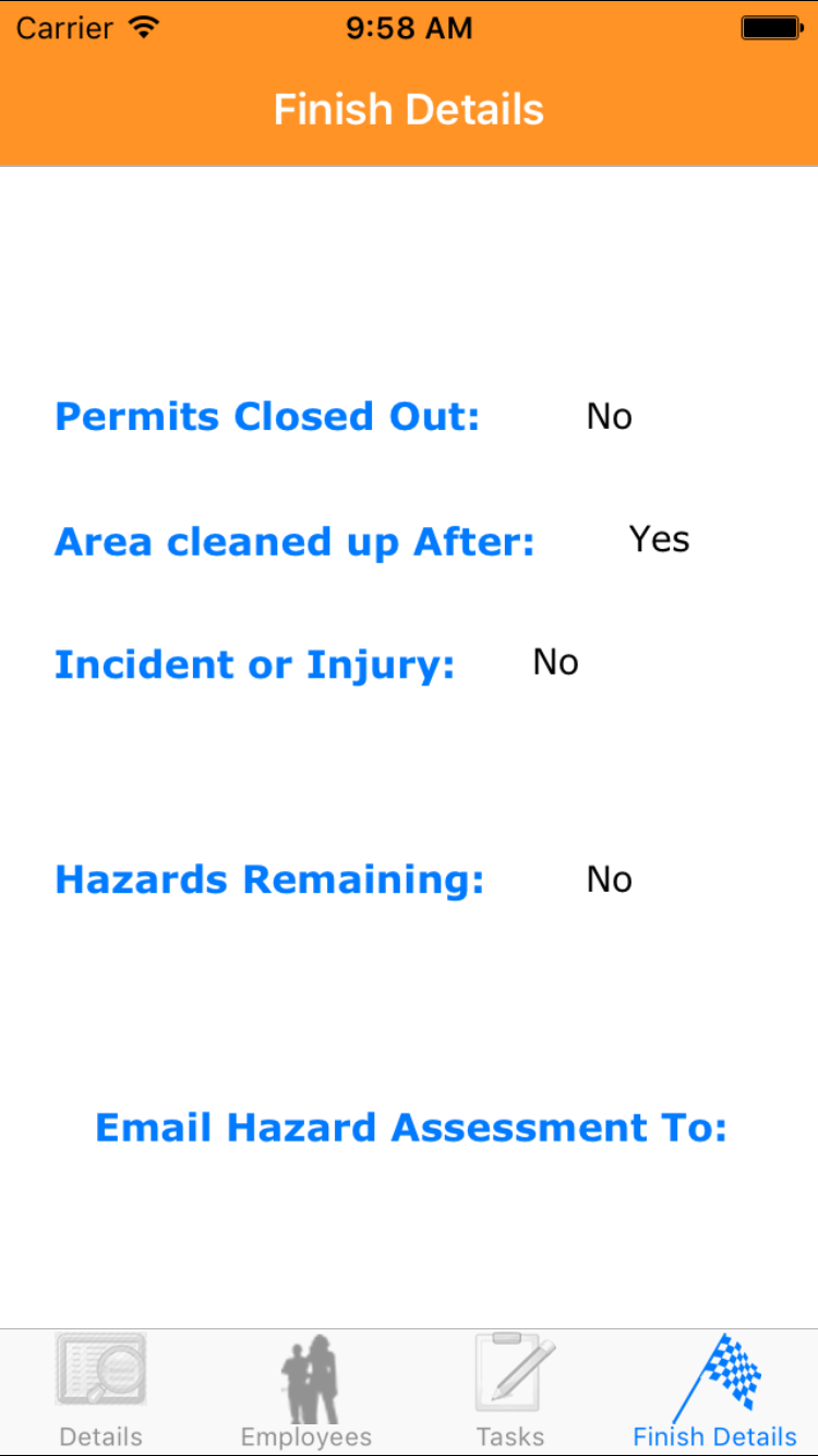 - Tap the fourth tab, the Final Details tab of the History view. This loads with the permits closed out, area cleaned up after, incident or injury description, hazards remaining description and the site contact email address.