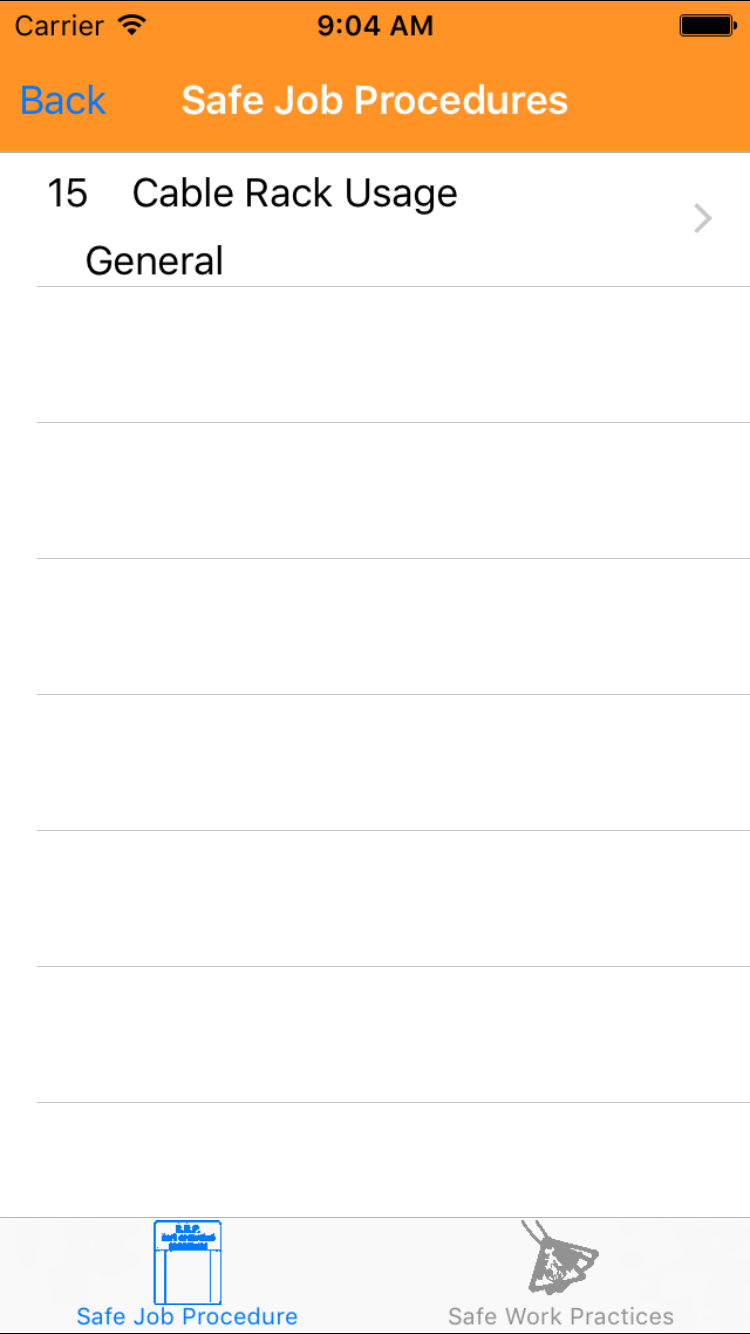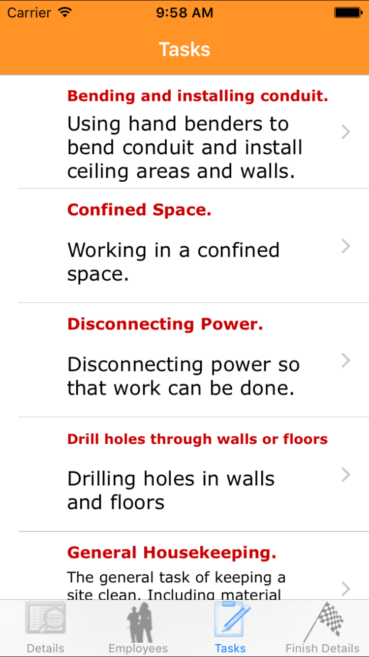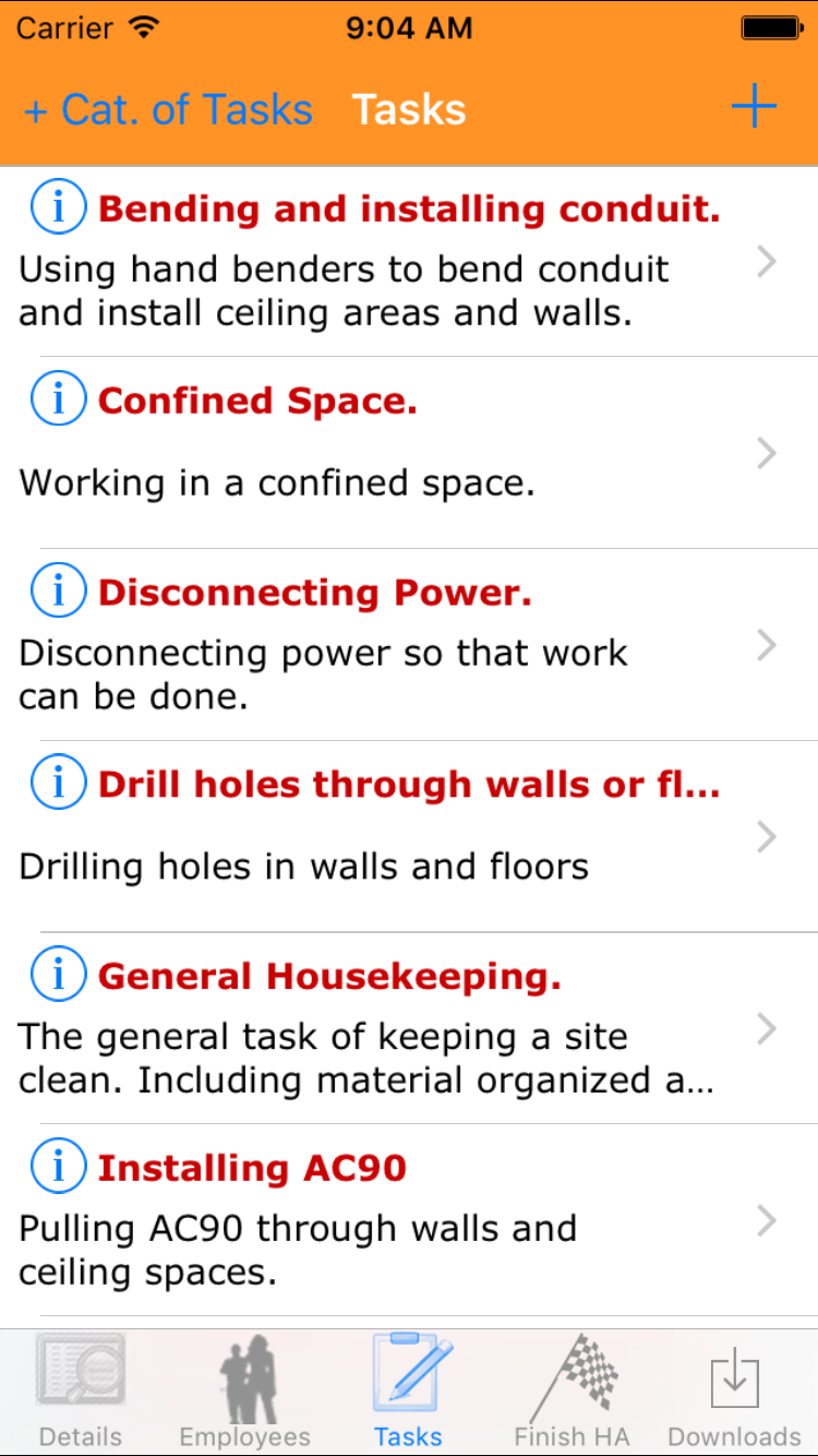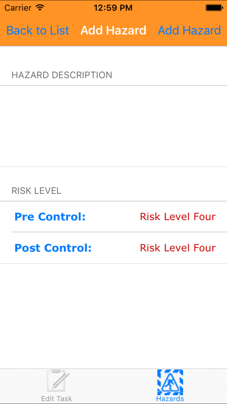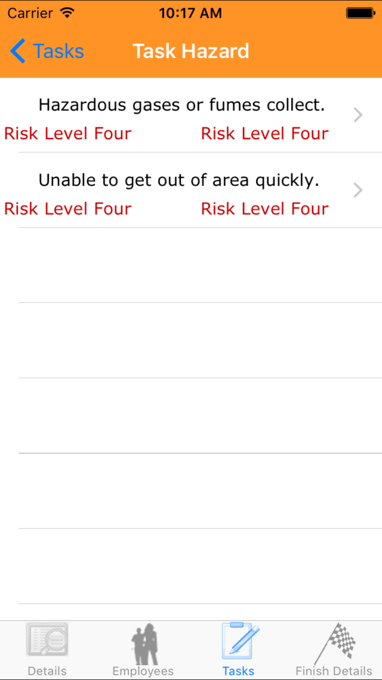 - Tap on a Task, to load the Task Hazard view. This loads the list of Task Hazards of a Task, displaying the hazard description, and the risk level of each task hazard.