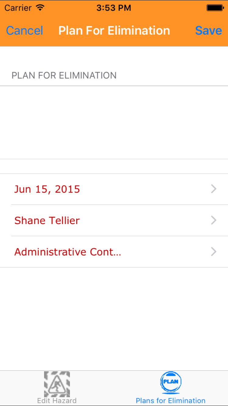 - Tap Add Save in the top right corner of the screen to edit the plan for elimination for the task hazard for the task.