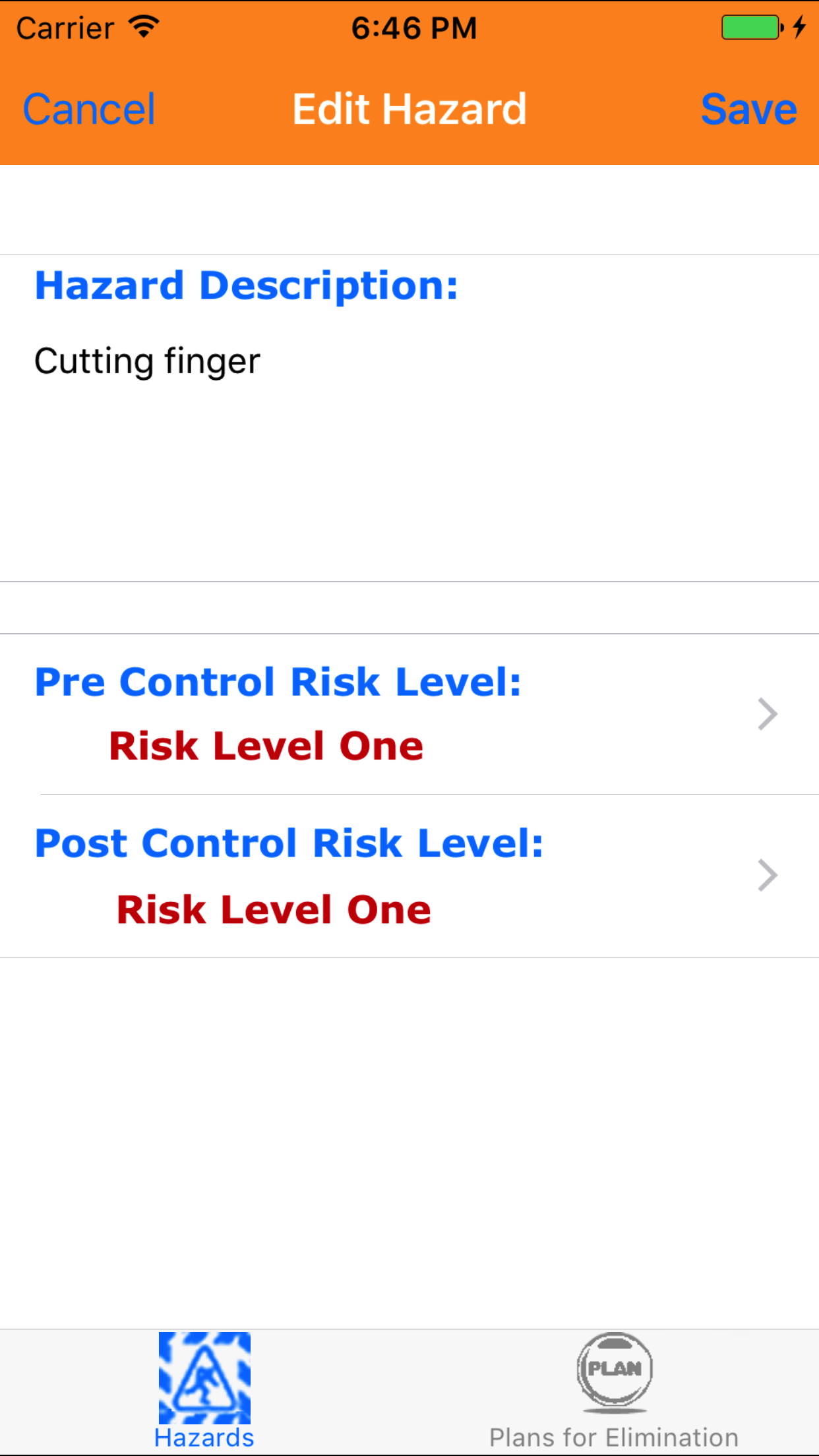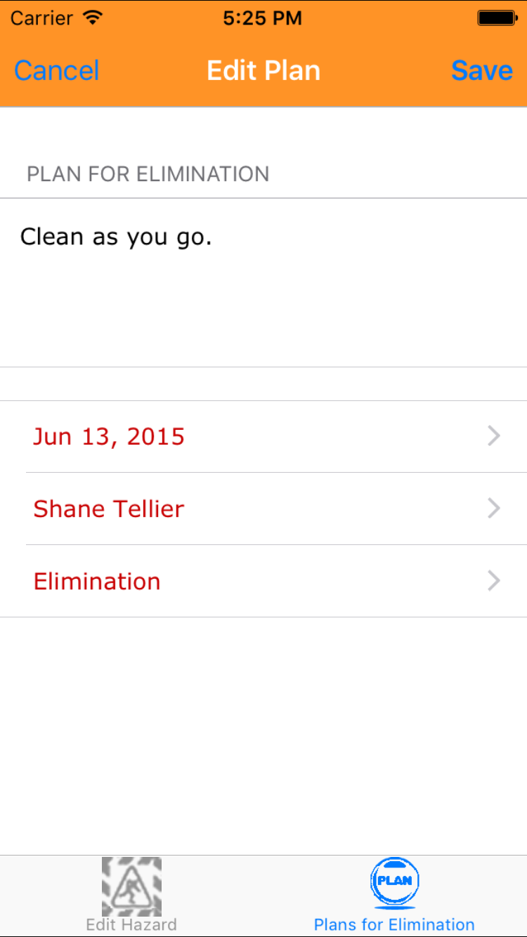 - Tap Save in the top right corner of the screen to edit the plan for elimination for the task hazard for the task.
