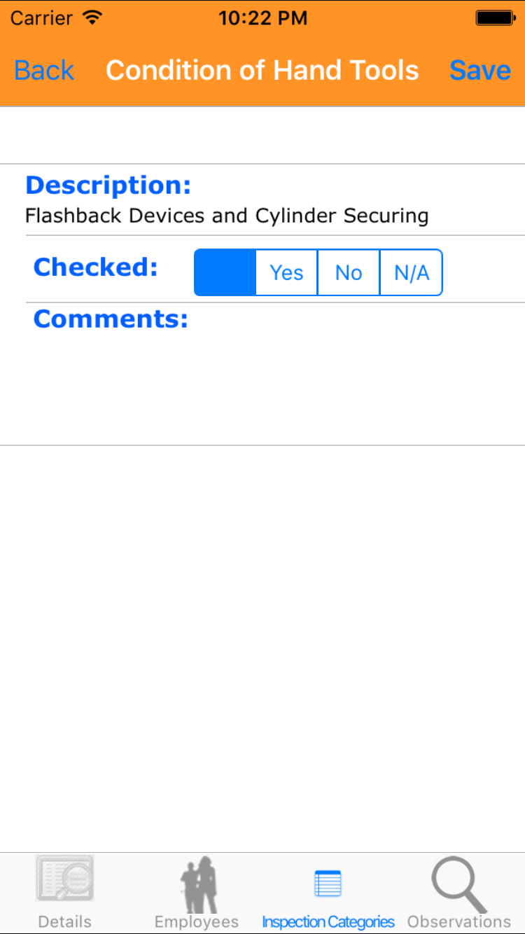 - Tap Save in the top right corner of the screen to save the condition of hand tools inspection task details
