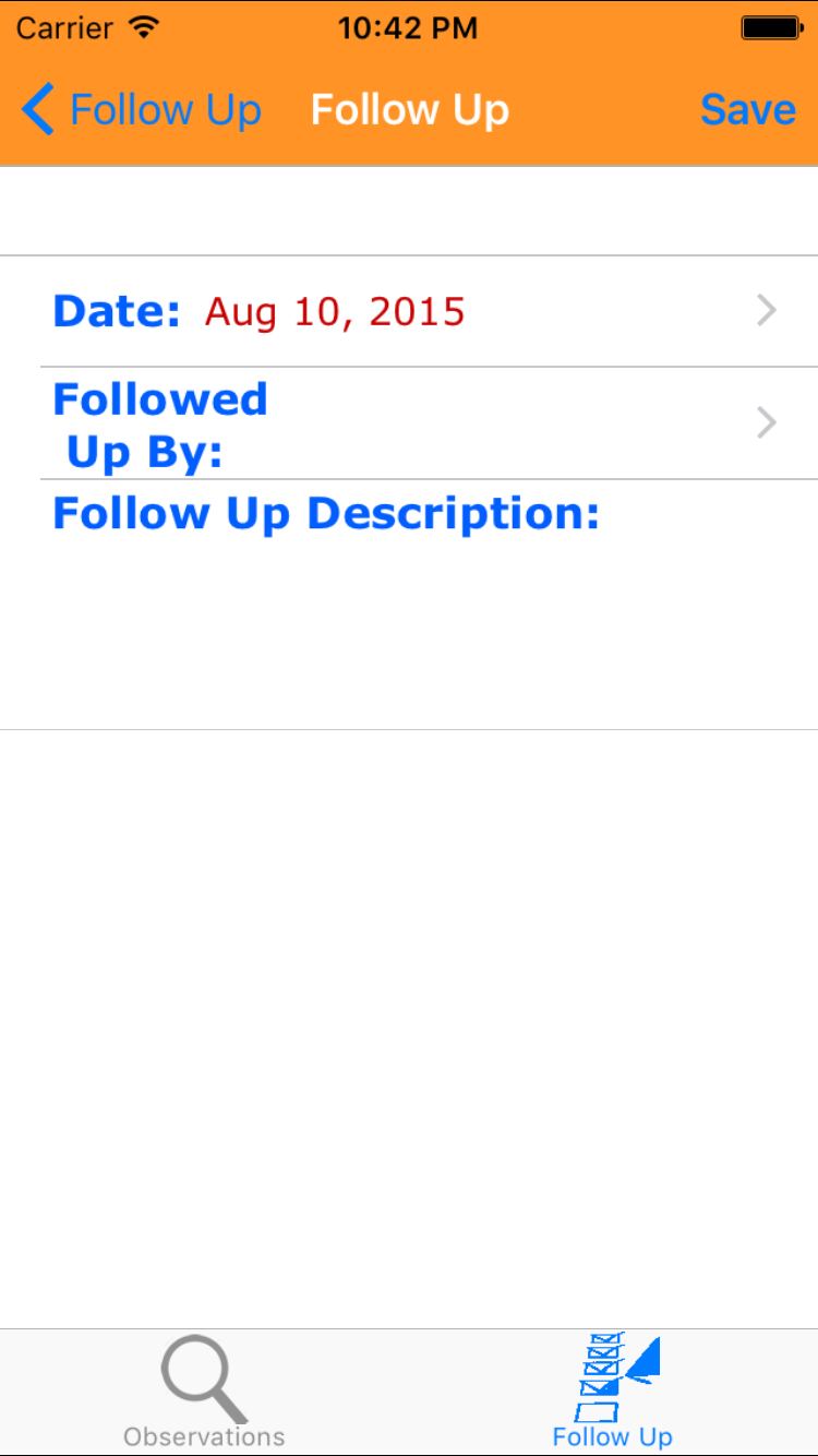 - Return to the Add Follow Up screen by either tapping Save in the top right corner to select the highlighted date or tapping Cancel in the top left corner to leave the Date: field unchanged.
