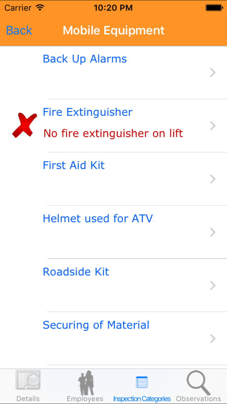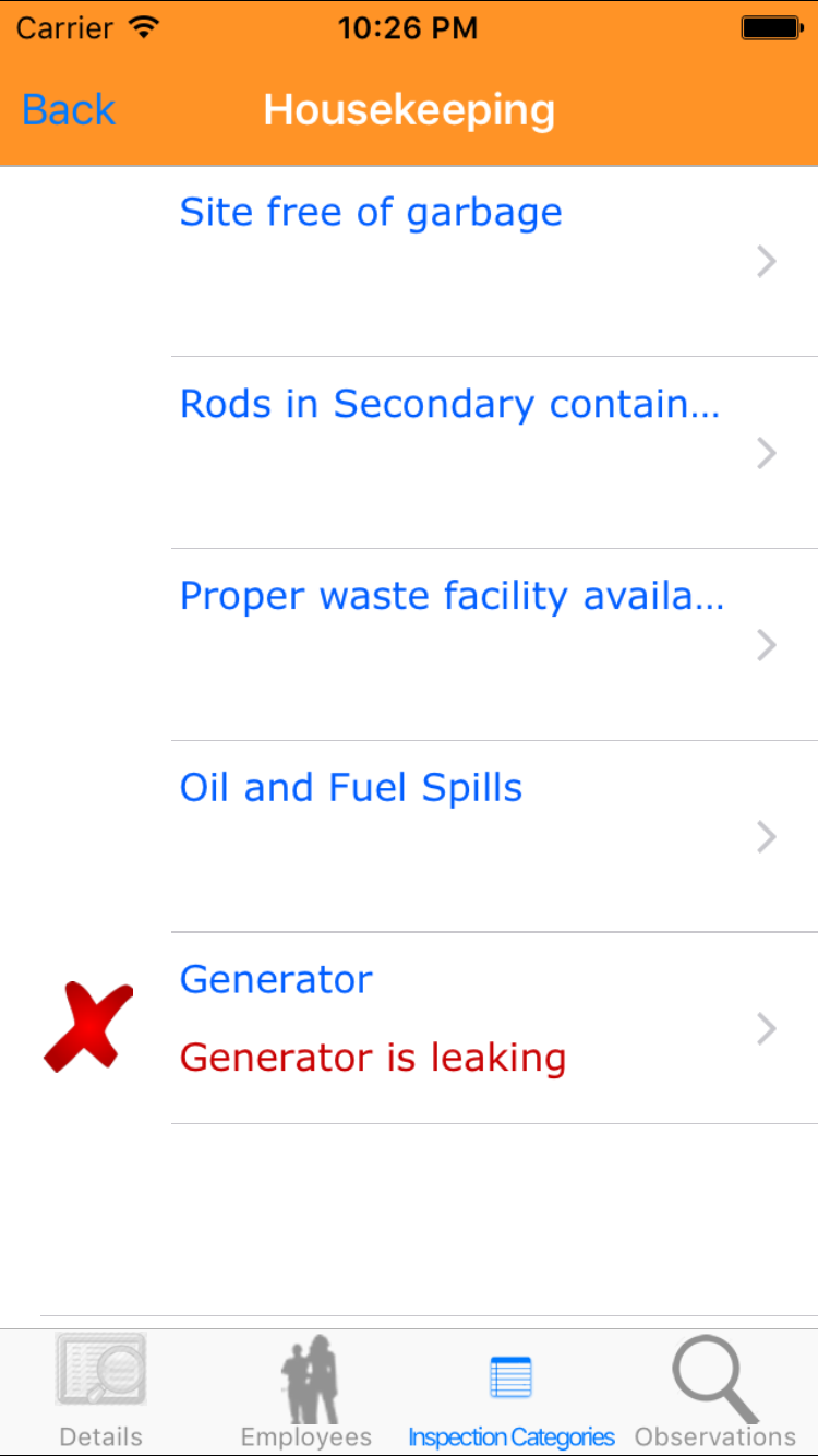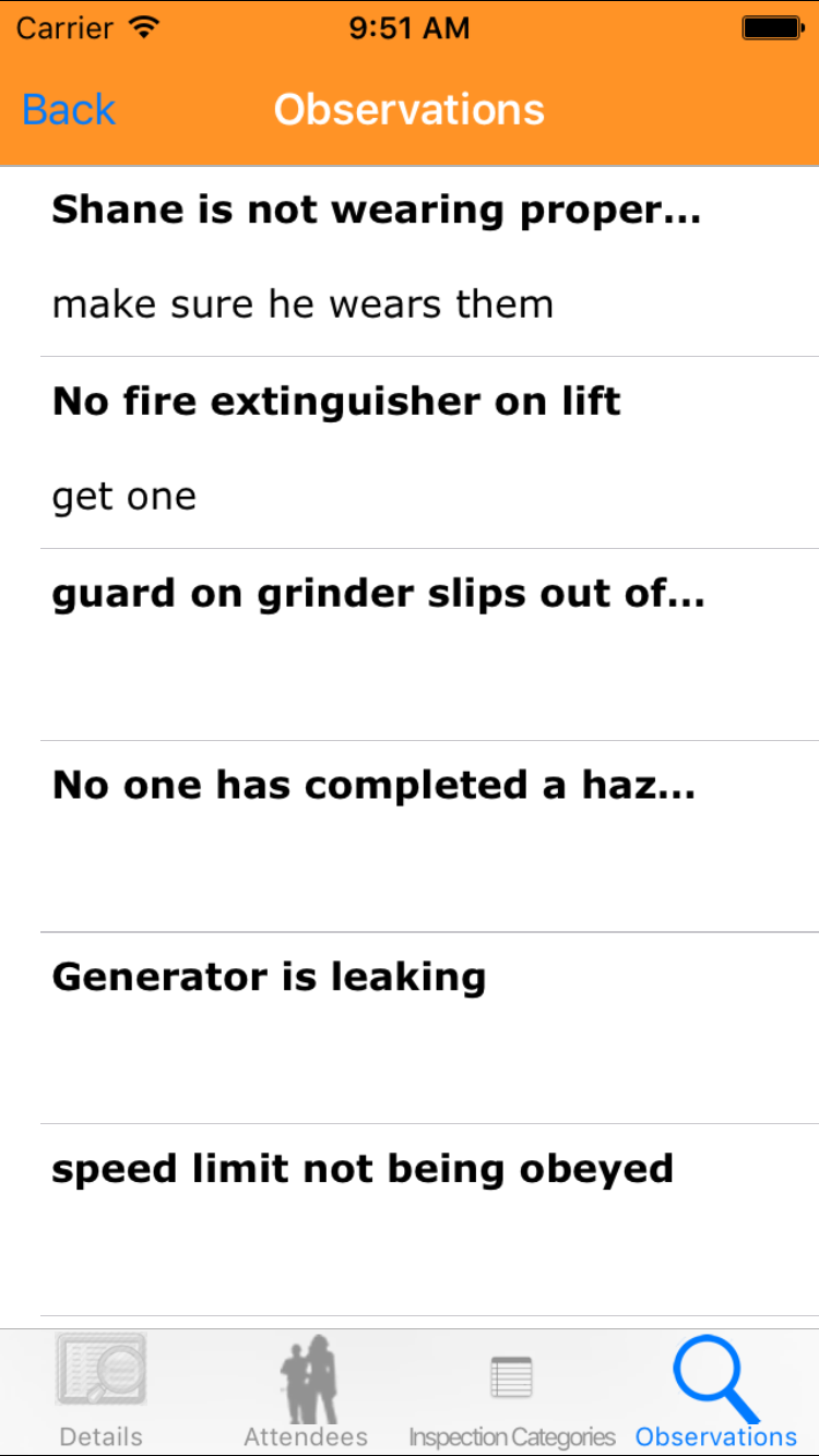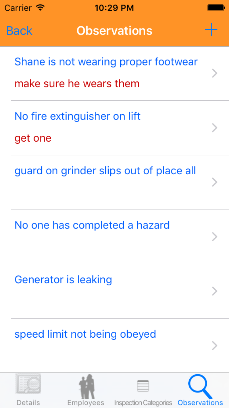 - Tap the Observation icon, the third tab. This opens the list of observations, observation/deficiency in red text and recommendation in blue text.