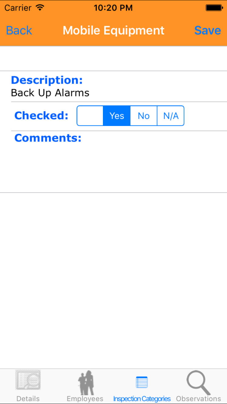- Tap Save in the top right corner of the screen to save the mobile equipment inspection task details