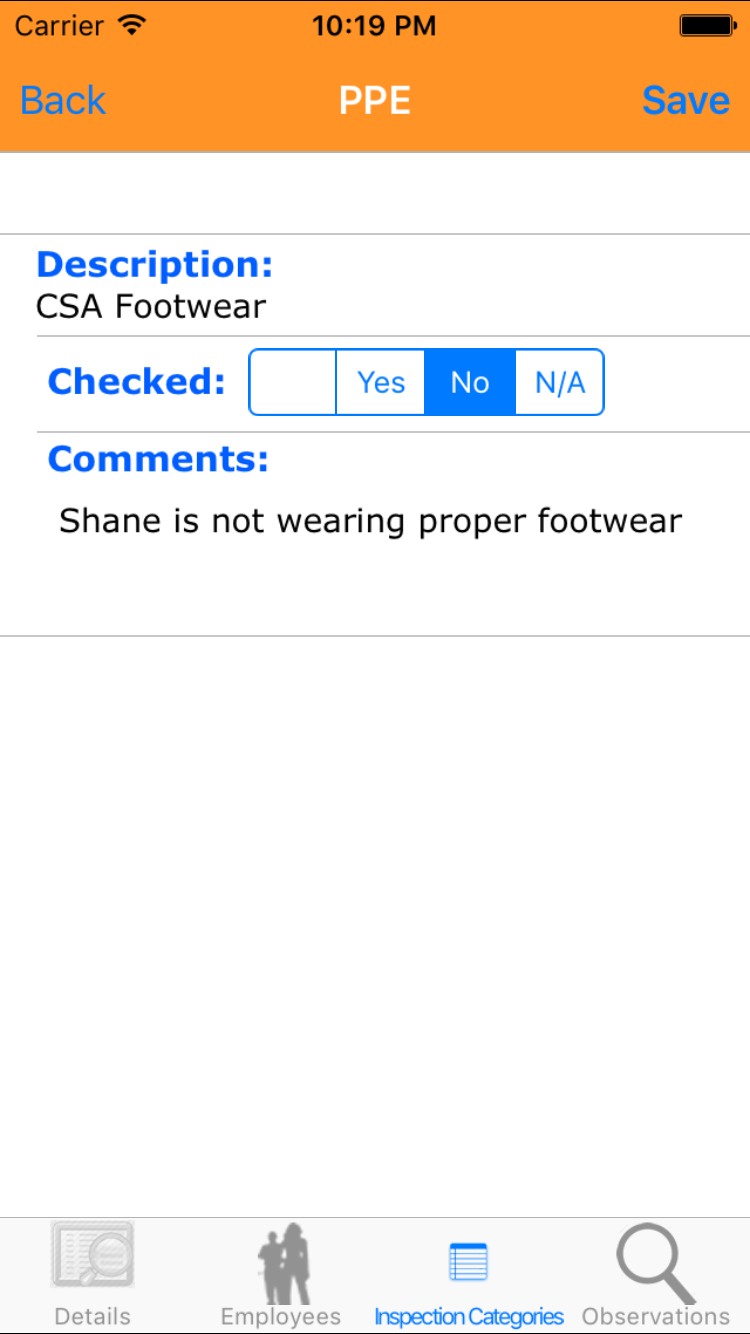 - Tap Save in the top right corner of the screen to save the personal protective equipment inspection task details