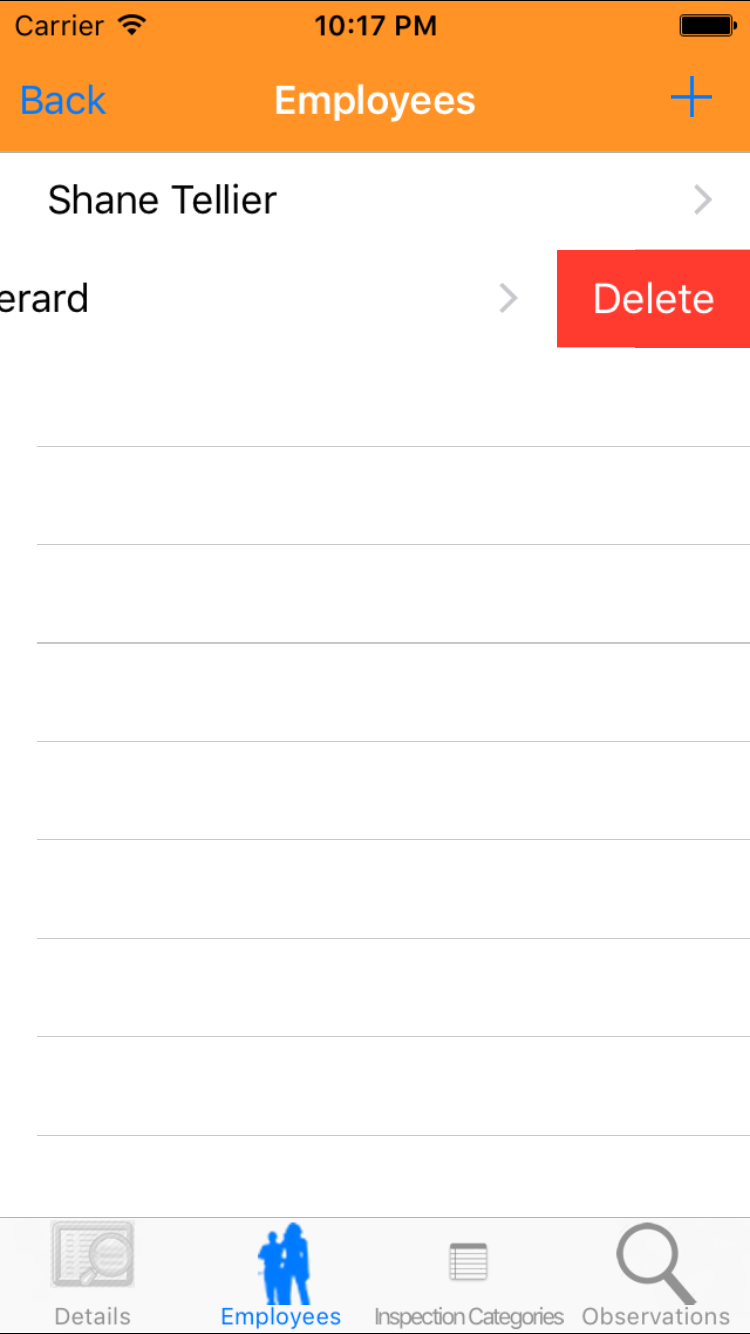 - Swipe from the right edge to the left to bring up the delete button for the employee.