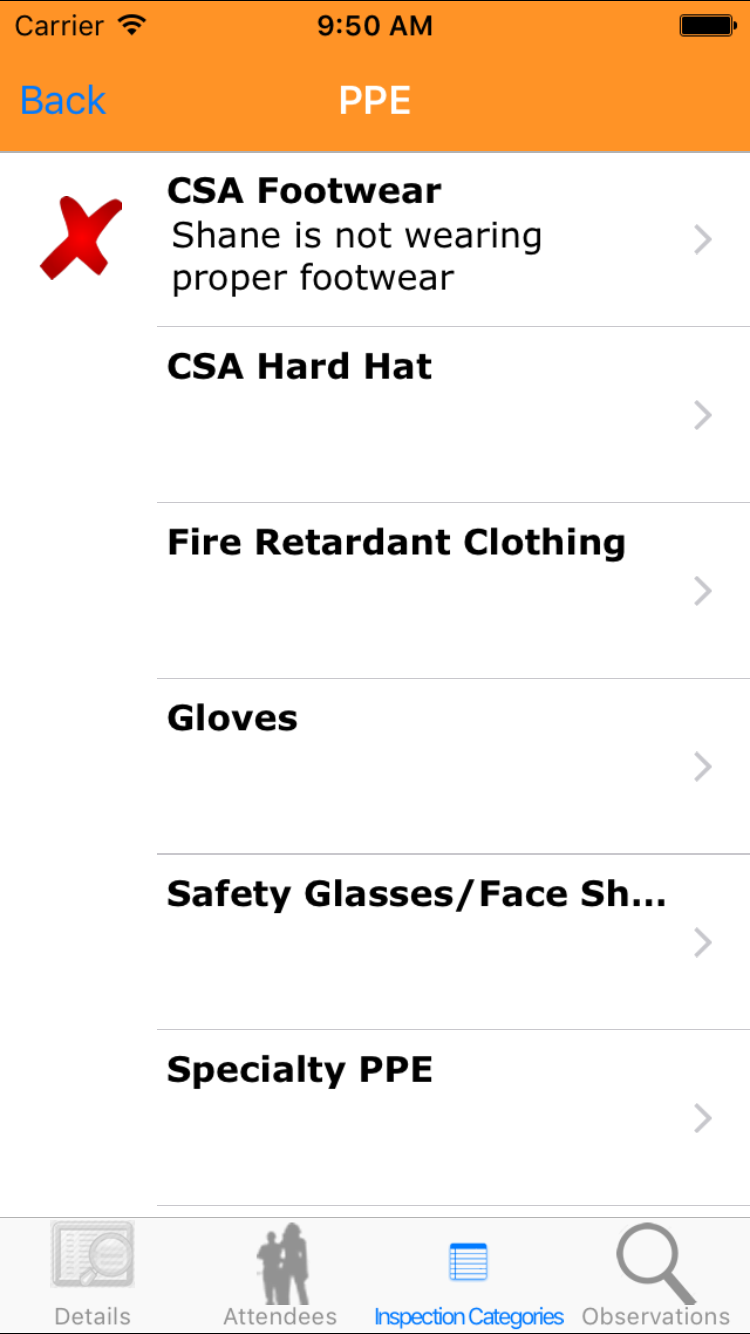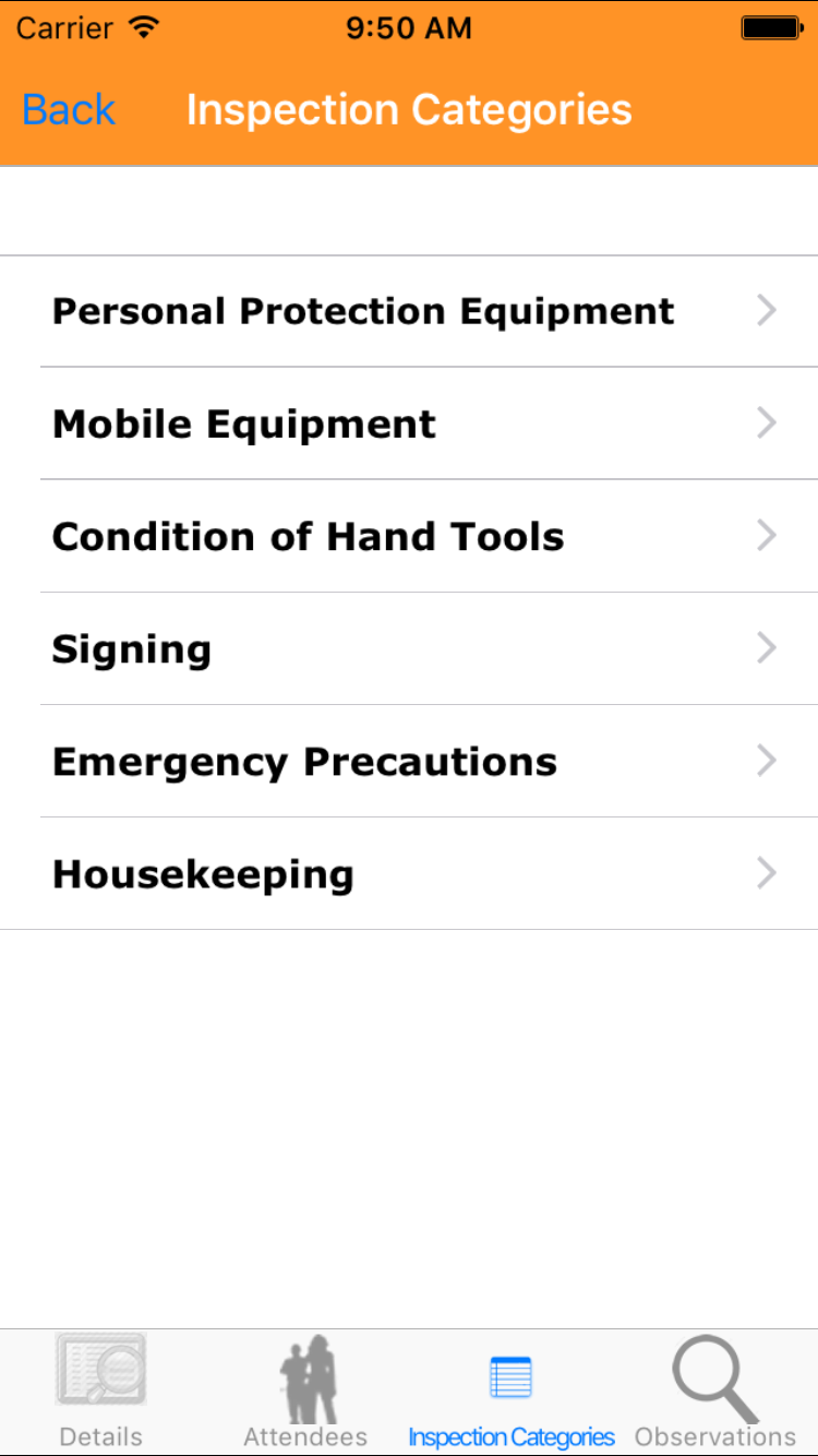 with the list of the 6 checklist categories of the safety inspection. Tap on each category to view the inspection tasks.