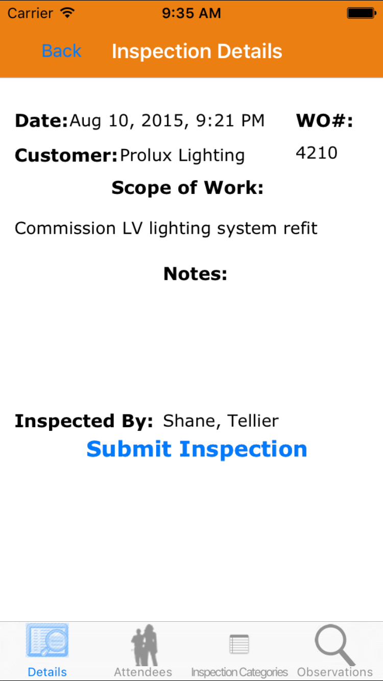It loads the following details including date, customer name, scope of work, notes, signature and inspected by name.