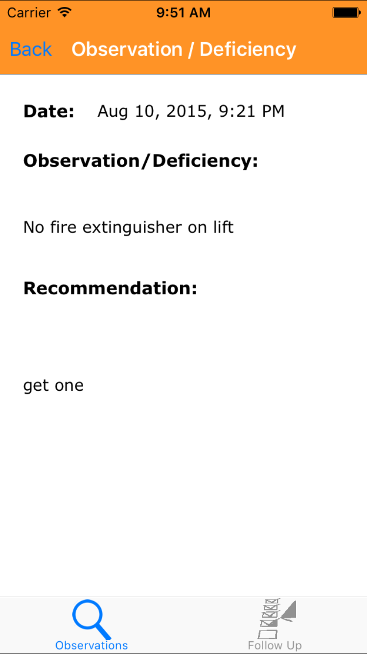 - Tap the Observation icon, the third tab. This opens the list of observations, observation/deficiency and recommendation in black text.