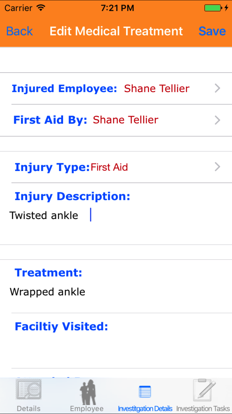 - First Aid By: The first aid by employee field initialy displays the name of the person who added the Safety Investigation and should be updated to indicate the employee who performed the needed first aid