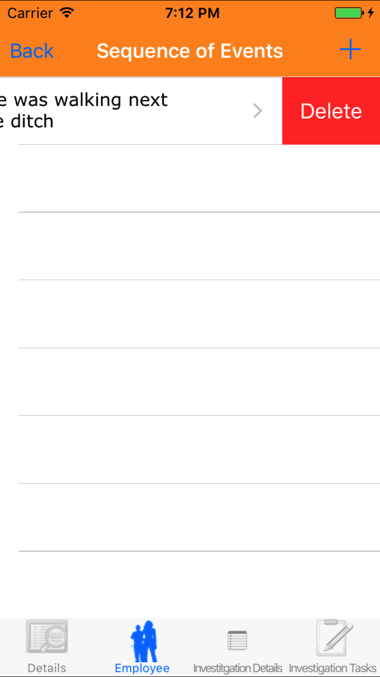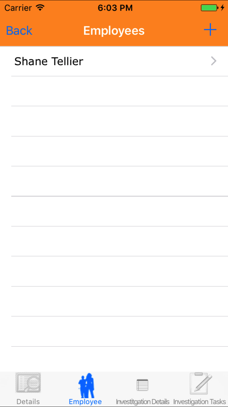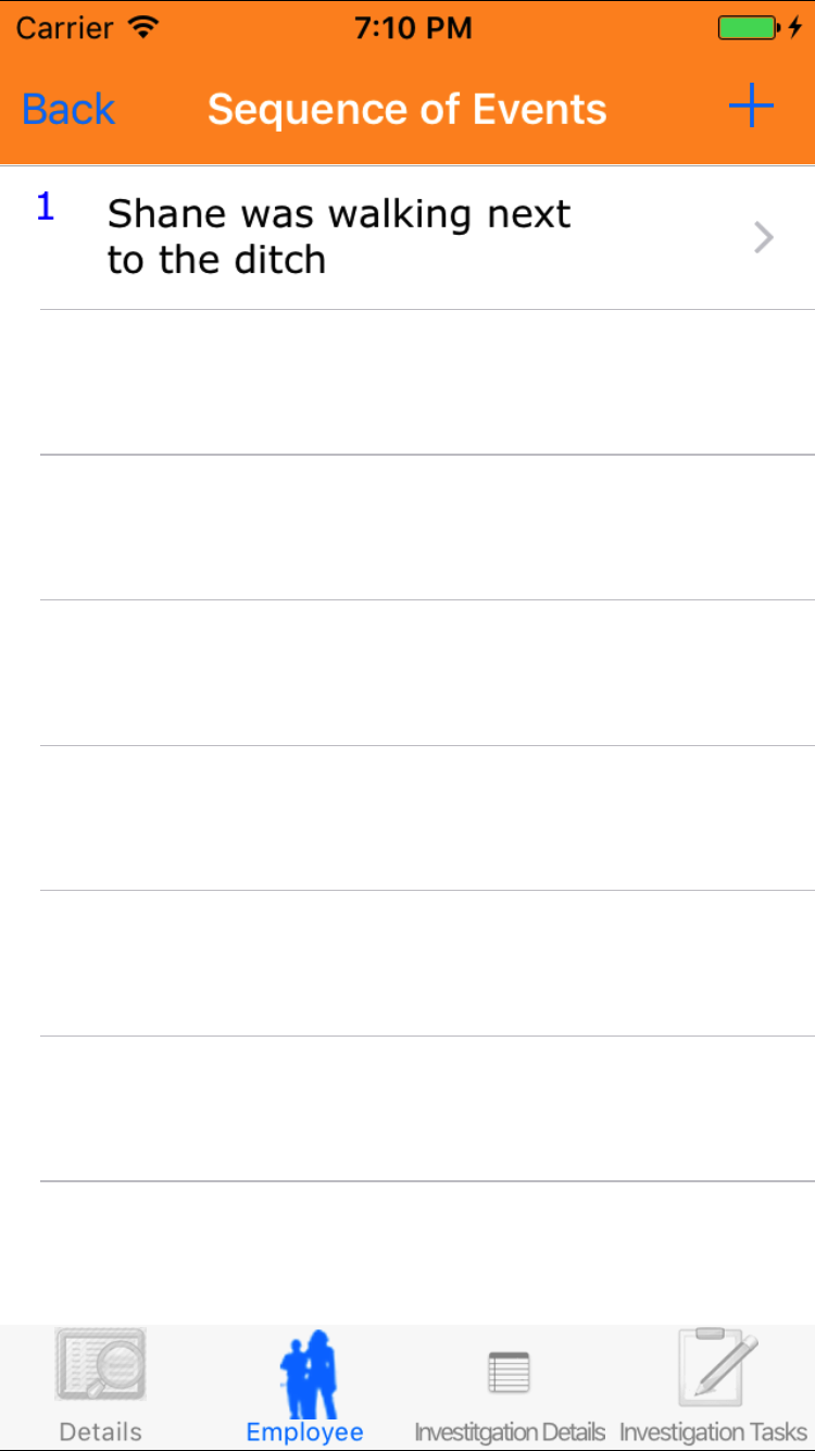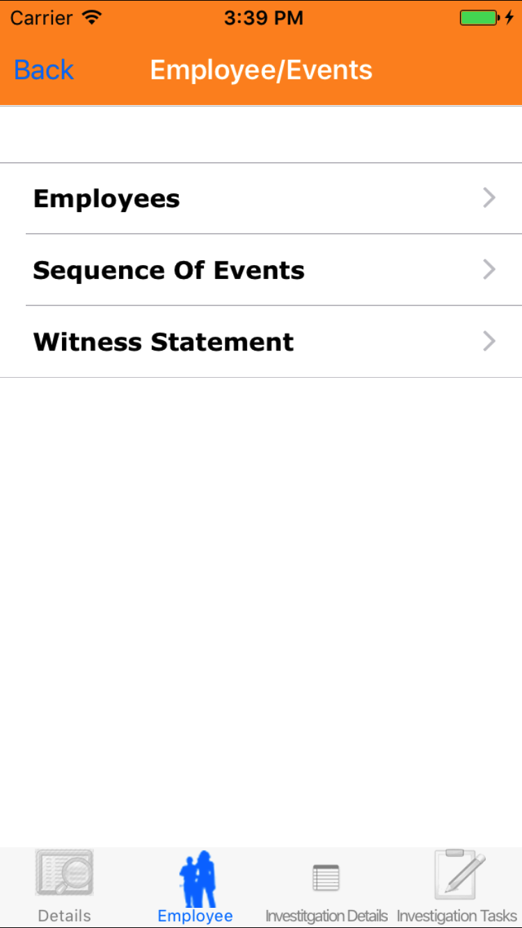 - Tap the Employee icon, the second tab. This opens the list of Employees, Sequence of Events, and Witness Statement.