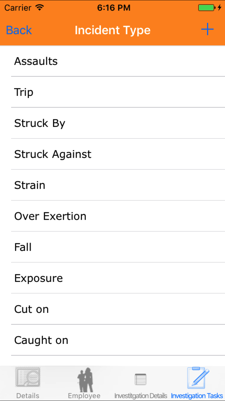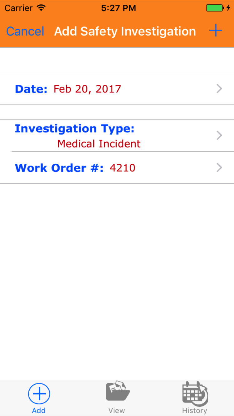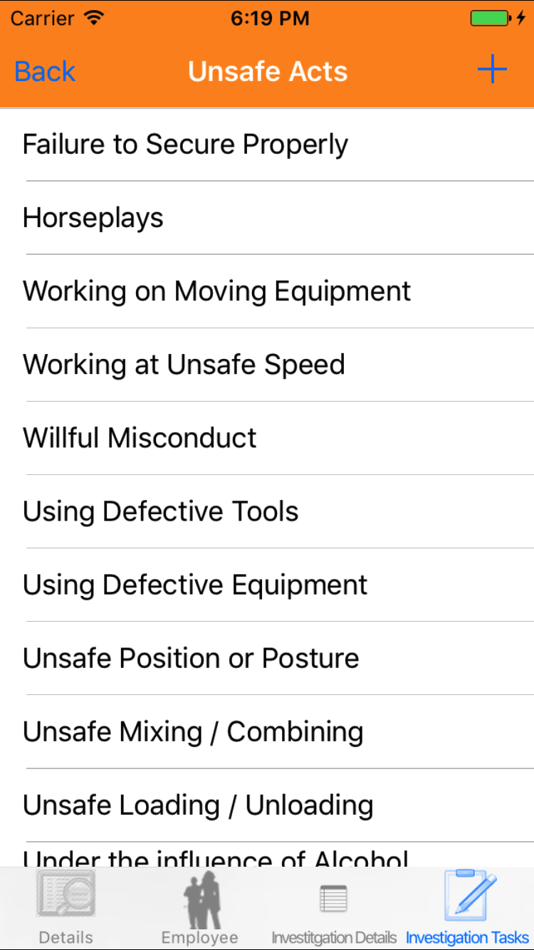 - Tap the + icon in the top right corner to add the Safety Investigation.