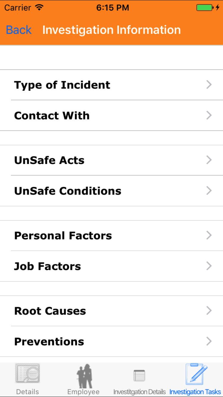 with the list of the 8 checklist categories of the safety investigation. Tap on each category to view the investigation tasks.