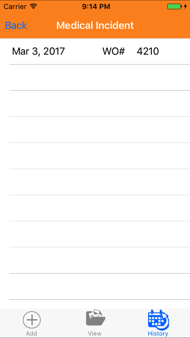 - Tap the desired work order to select it or tap Back in the top left corner to leave the Work Order # field unchanged and return to the Add Safety Investigation screen.