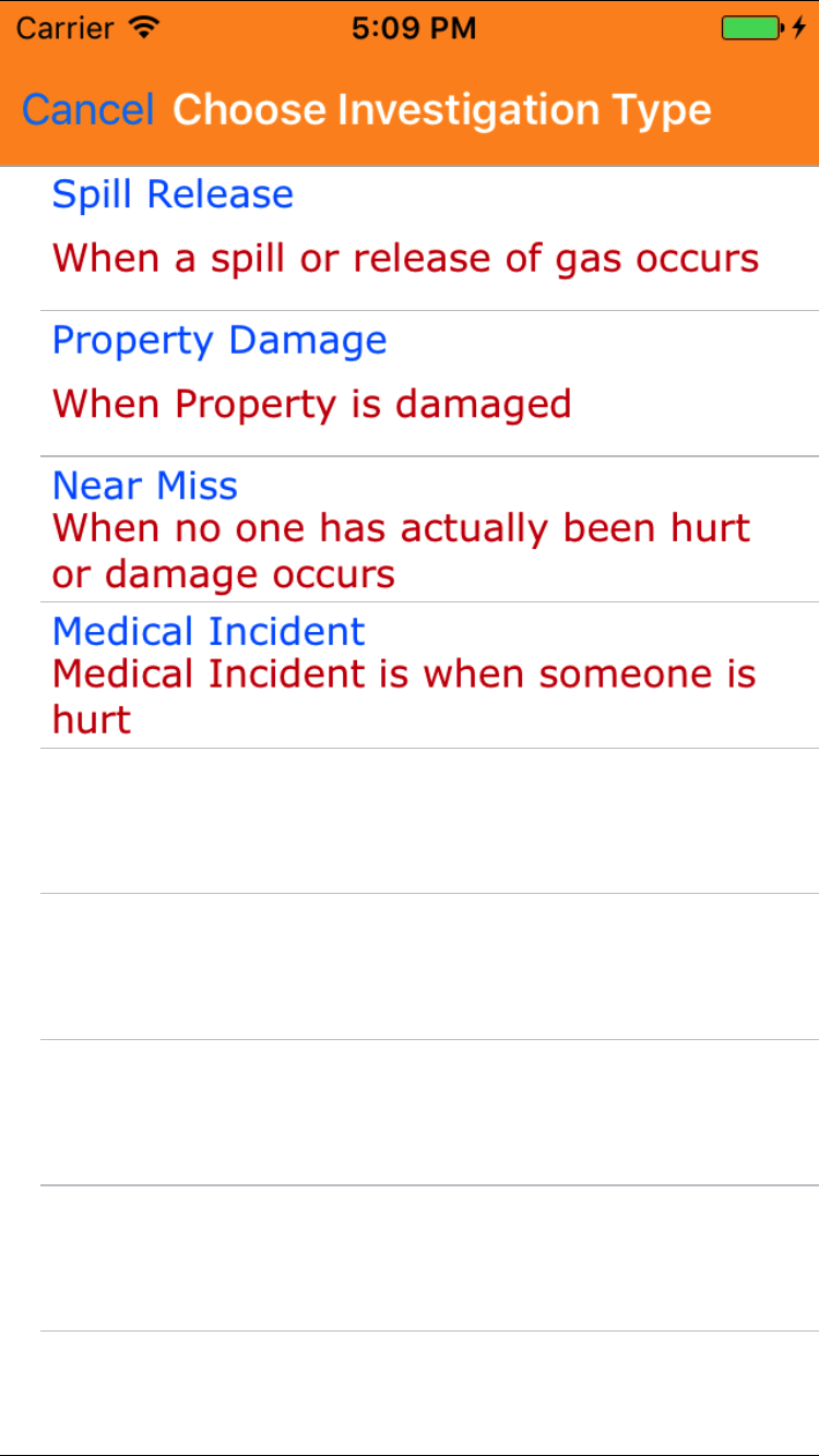 - Tap the Investigation Type field to open the Choose Investigation Type screen.
