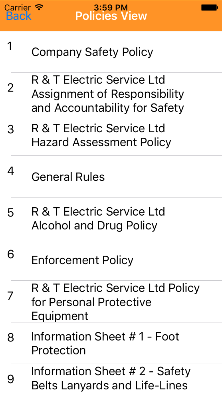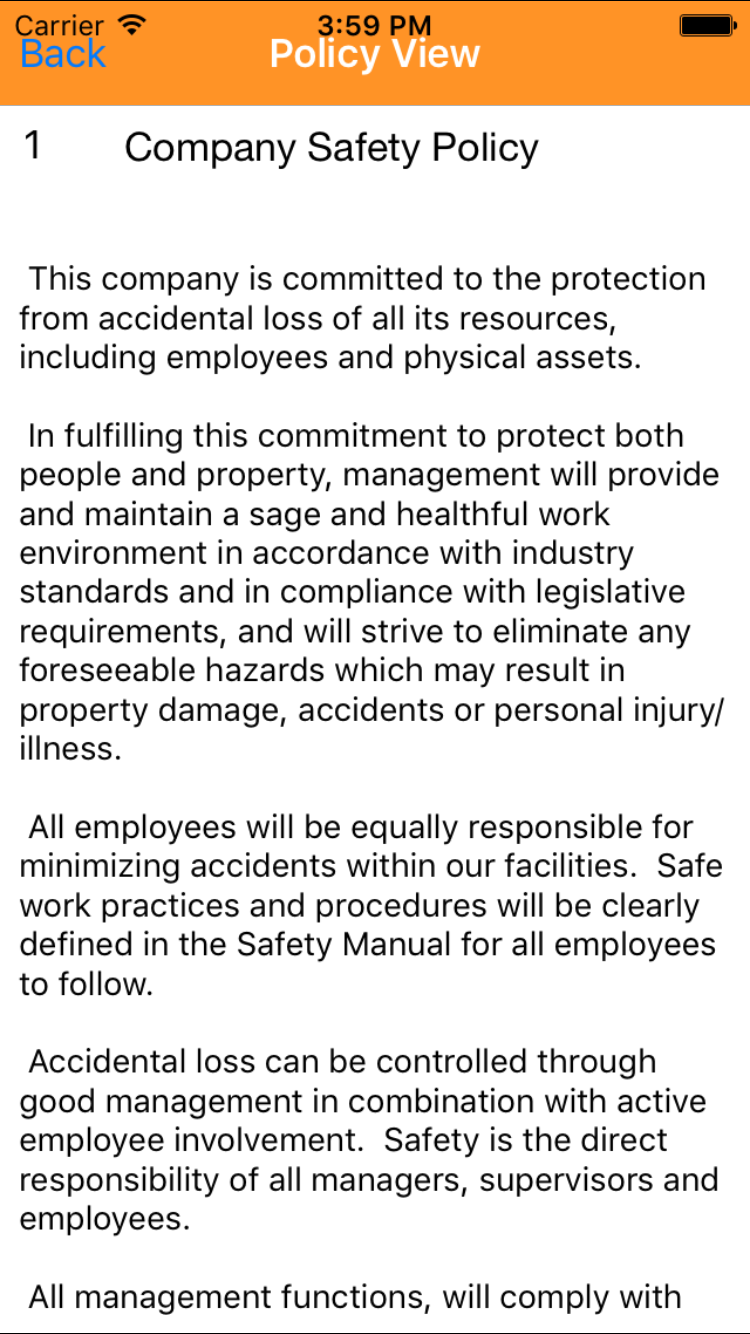 The safety policy section in the IPhone application allows companies to give field staff access to the safety policies of their safety program.