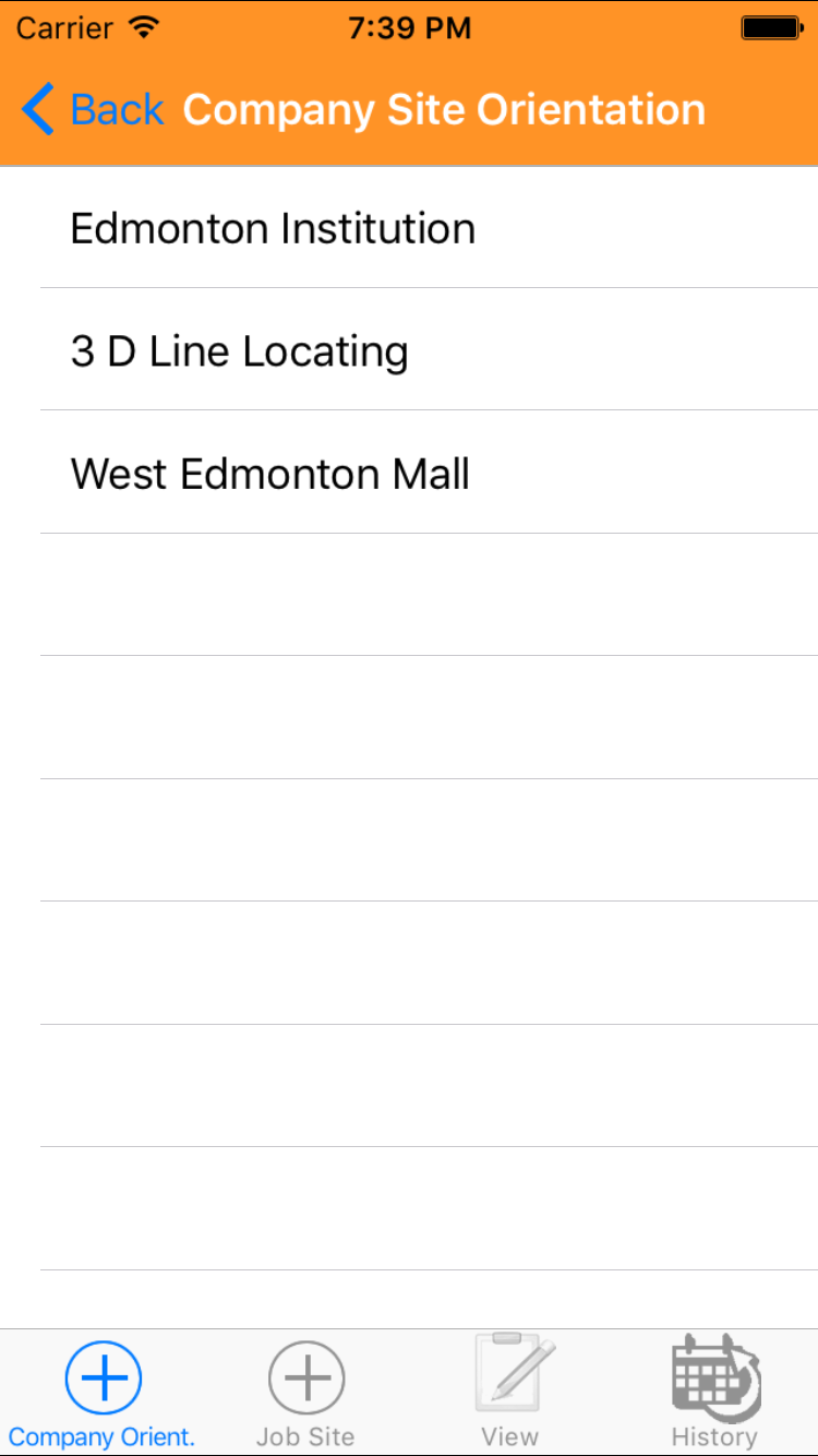 - Tap the desired job site to select it or tap Back in the top left corner to leave the Company Site Orientation field unchanged and return to the Add Site Orientation screen.