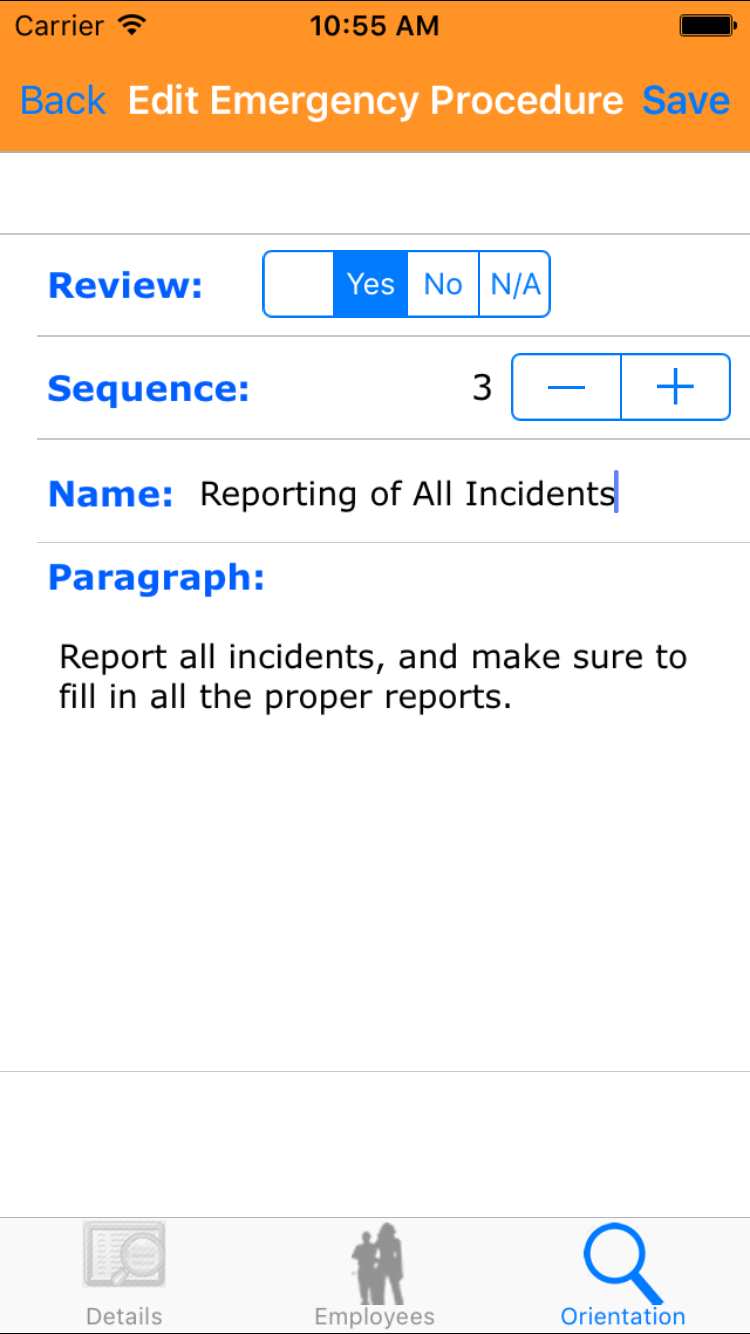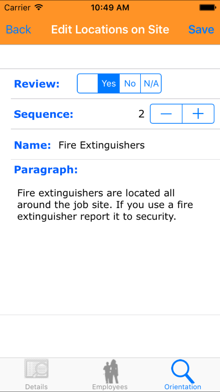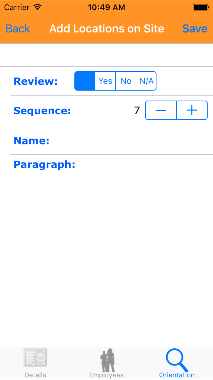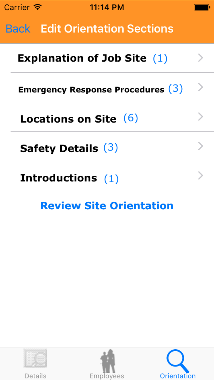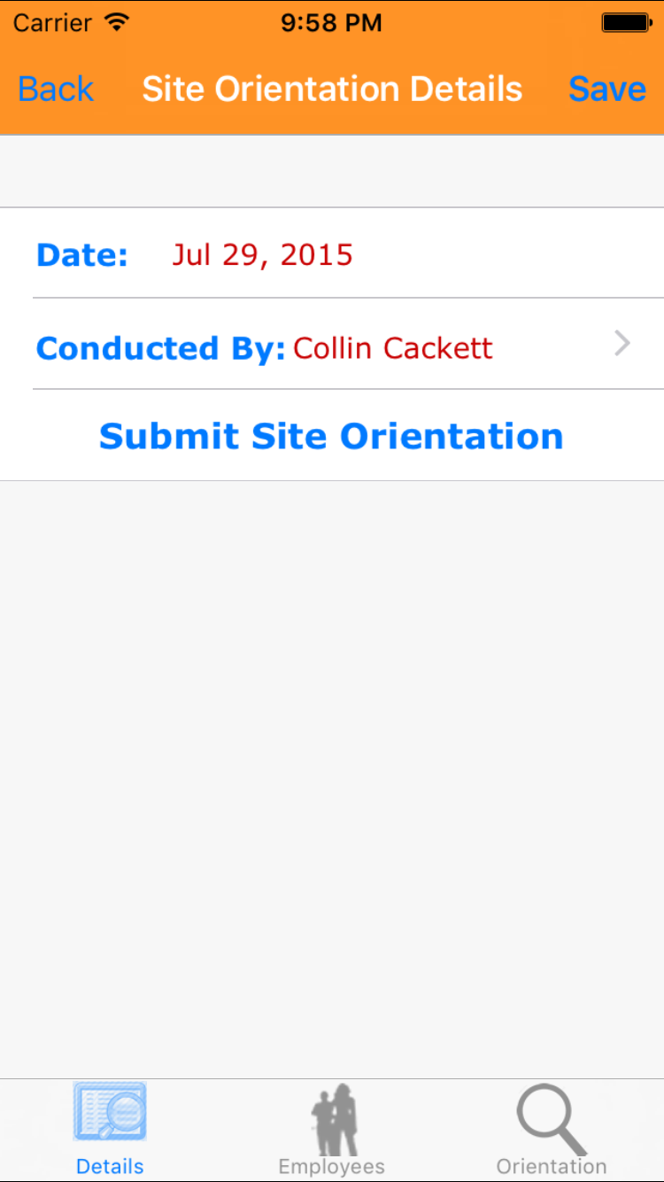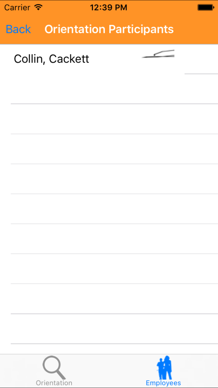 - Tap the desired employee to select it or tap Back in the top left corner to leave the Employee field unchanged and return to the Edit Site Orientation screen.