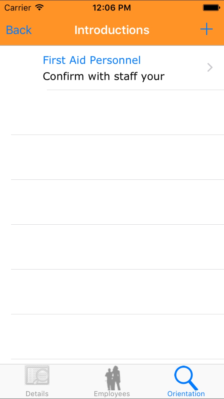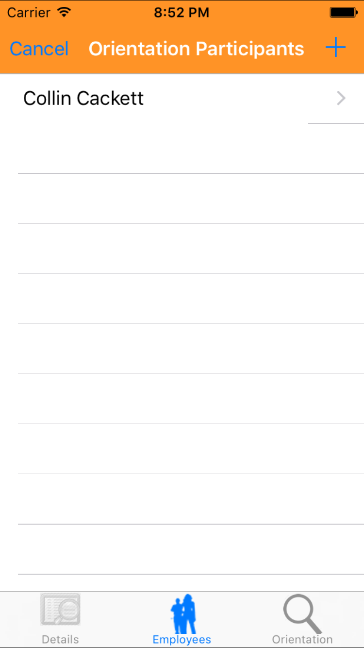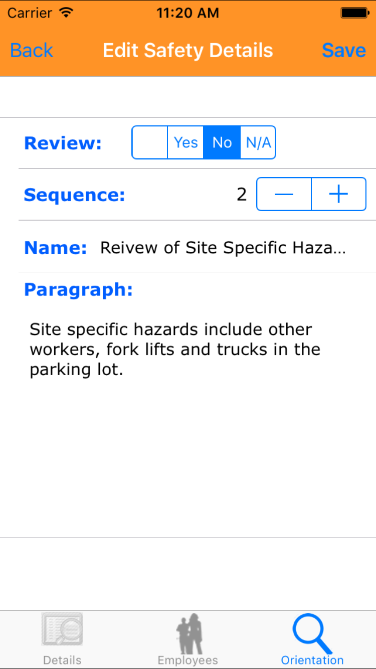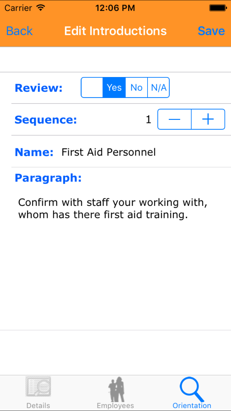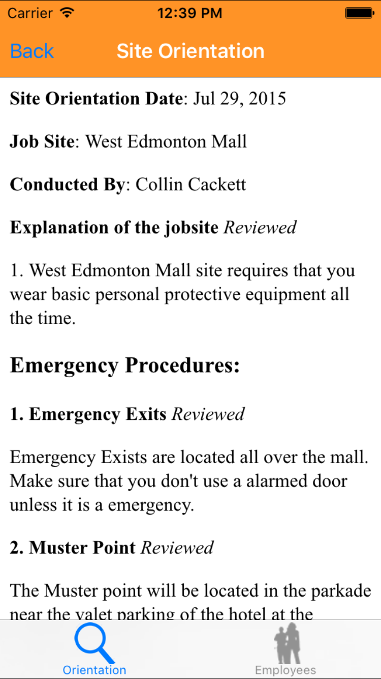 - Tap the desired employee to select it or tap Back in the top left corner to leave the Employee field unchanged and return to the Edit Site Orientation screen.