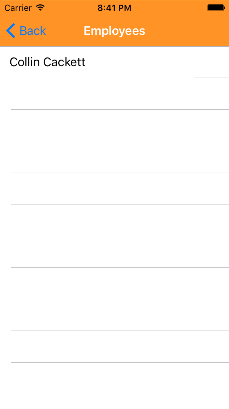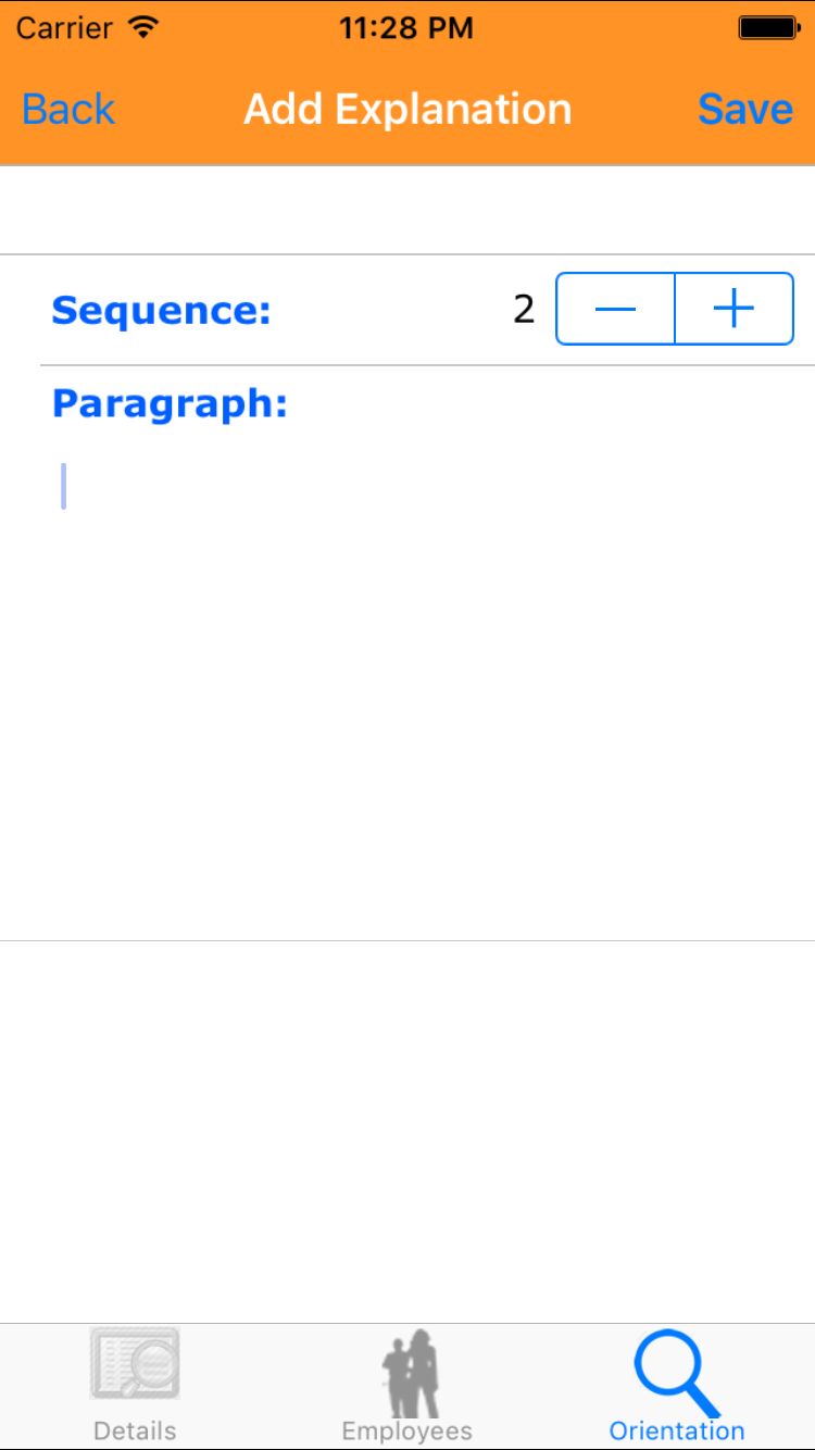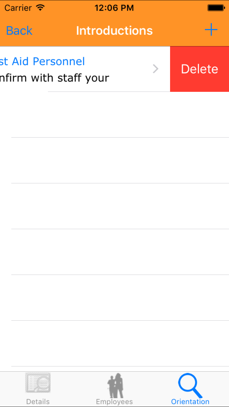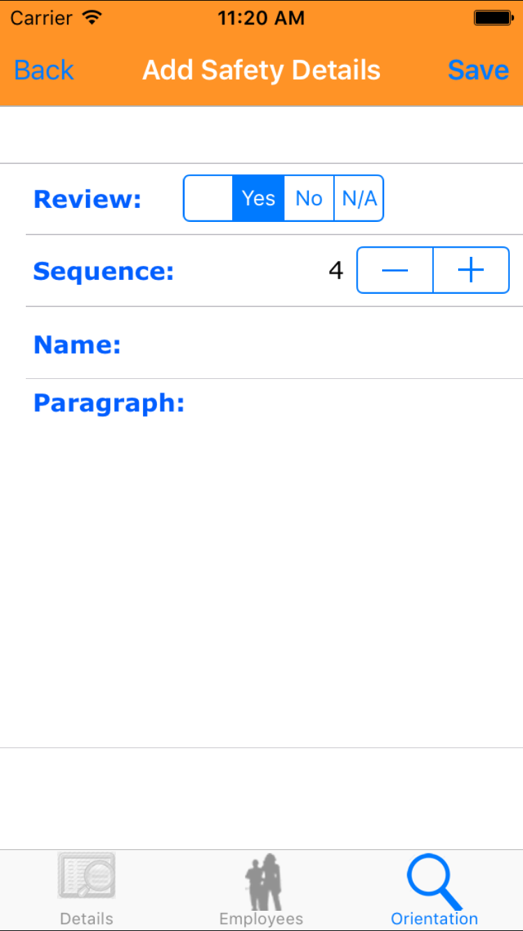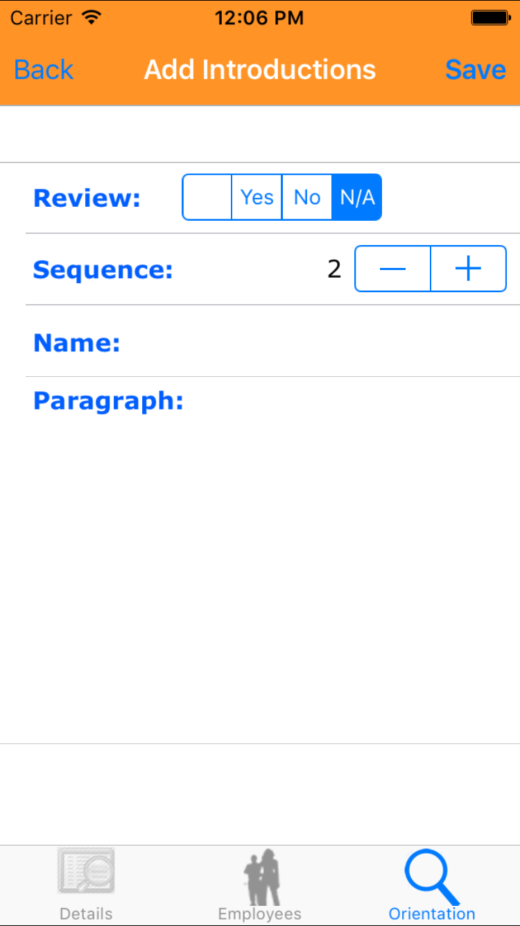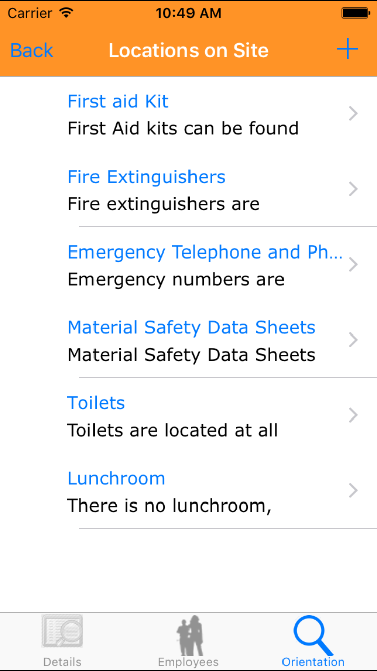 - Tap the desired employee to select it or tap Back in the top left corner to leave the Employee field unchanged and return to the Edit Site Orientation screen.