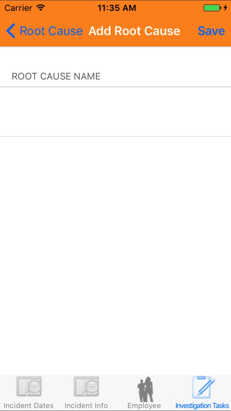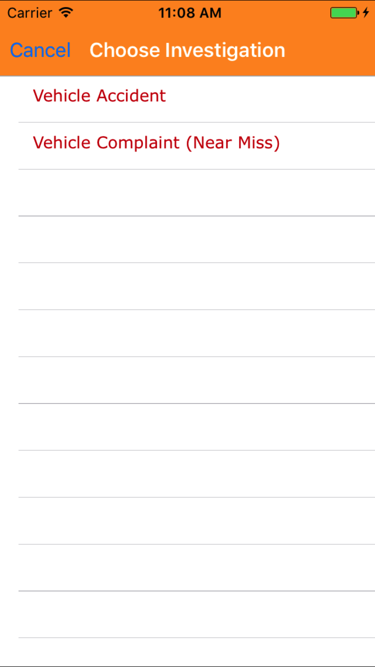 - Return to the Add Vehicle Investigation screen by either tapping Save in the top right corner to select the highlighted work order or tapping Cancel in the top left corner to leave the Investigation Type field unchanged.