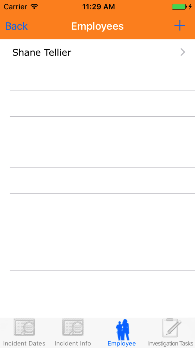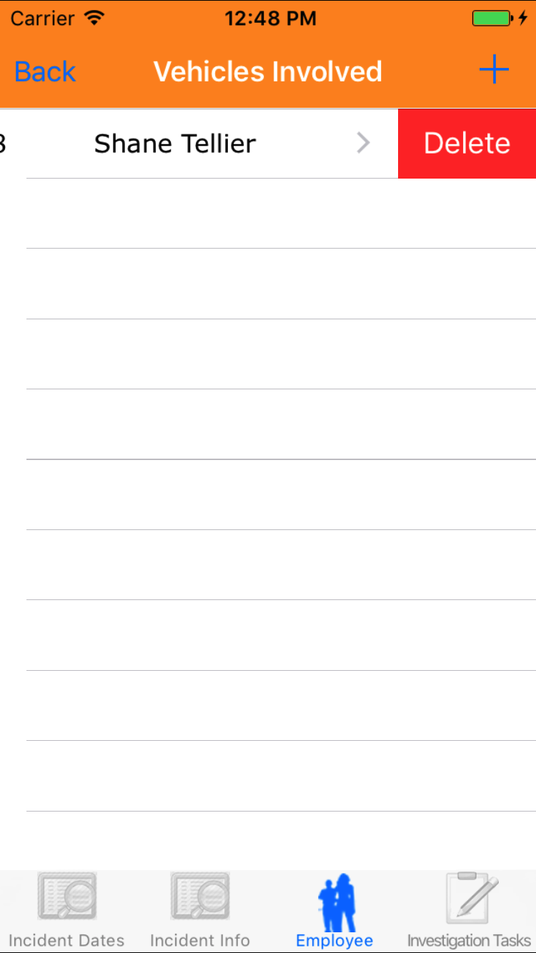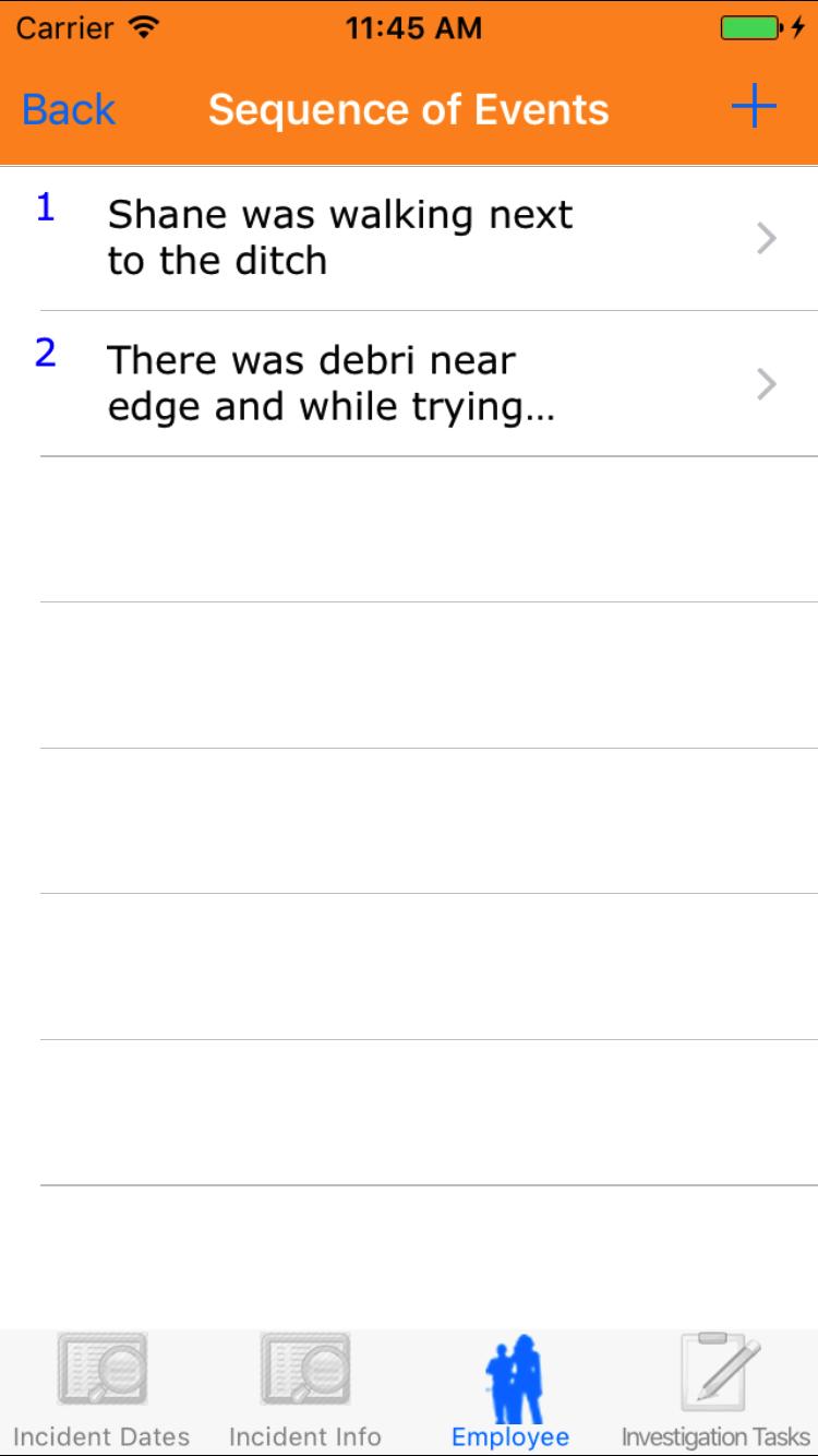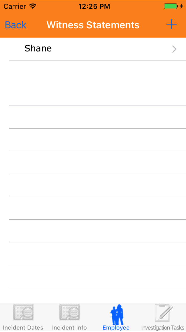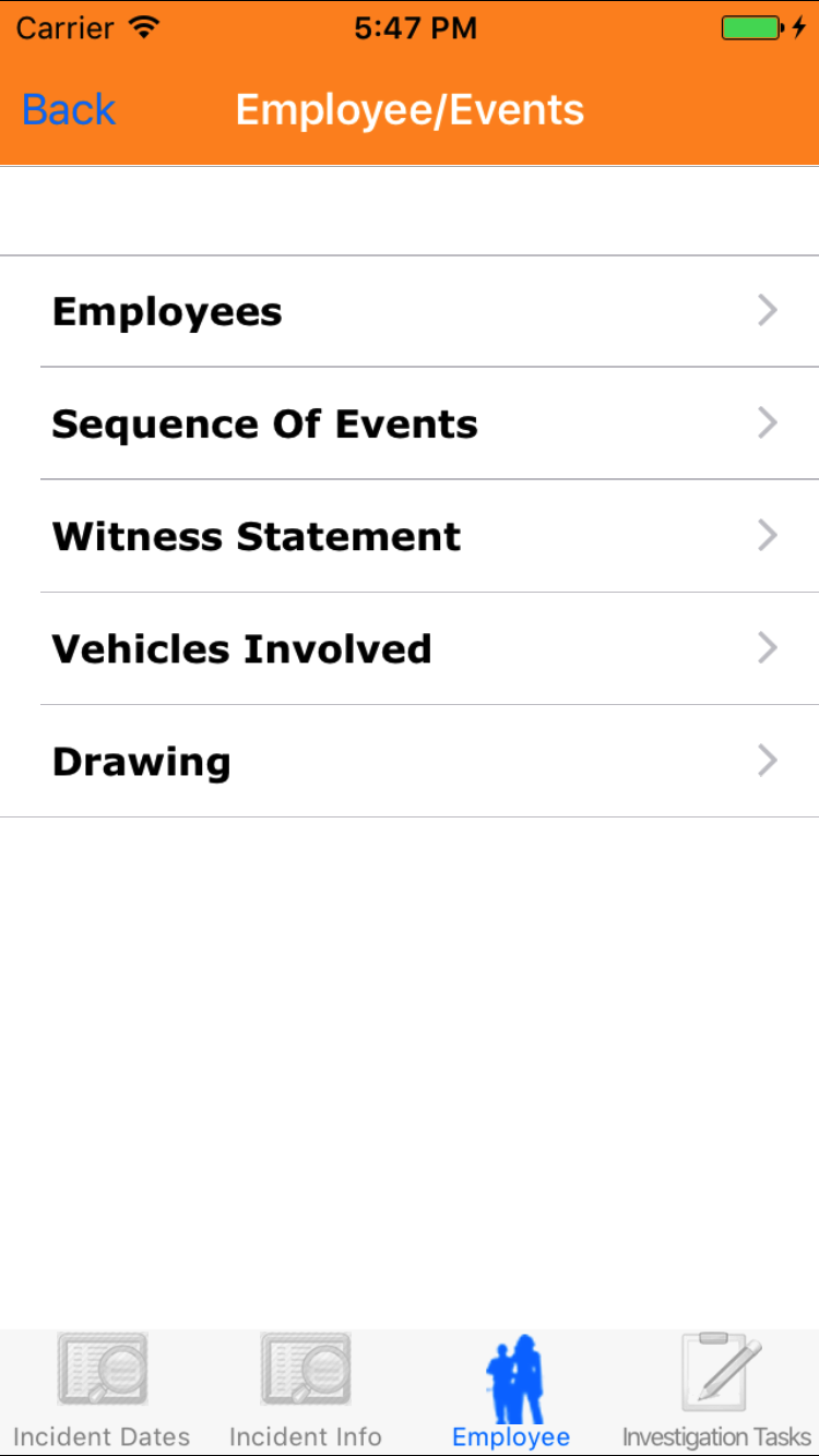 - Tap the Employee icon, the third tab. This opens the list of Employees, Sequence of Events, Witness Statement, Vehicle Involved, and Drawing.