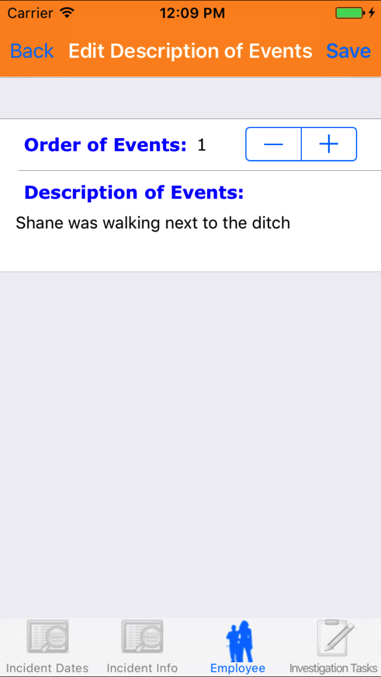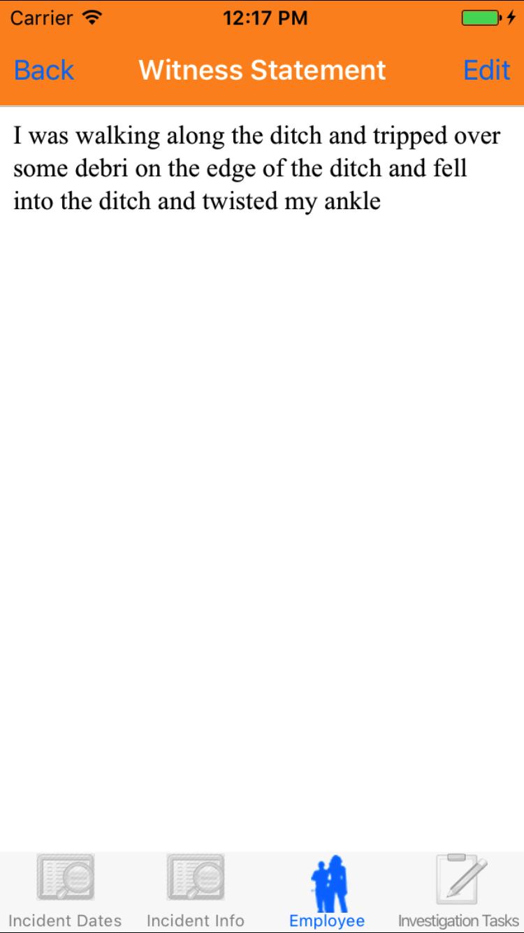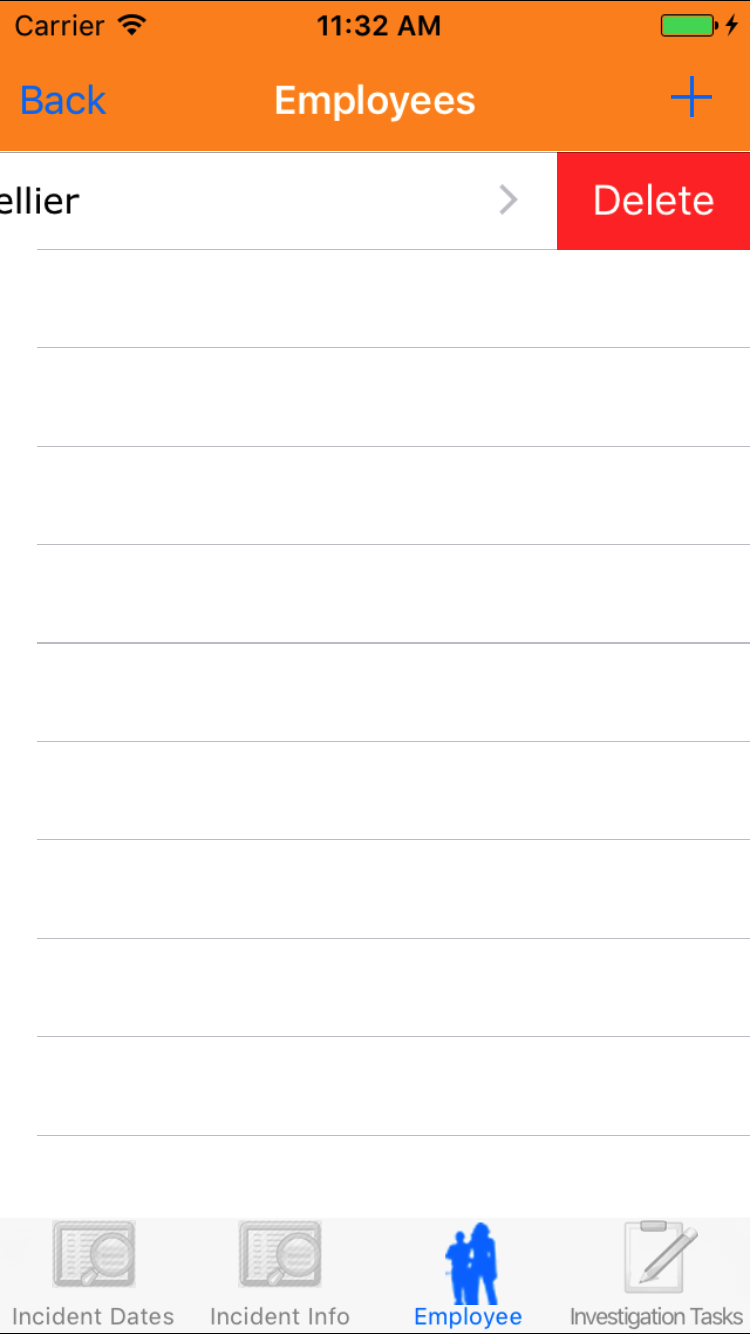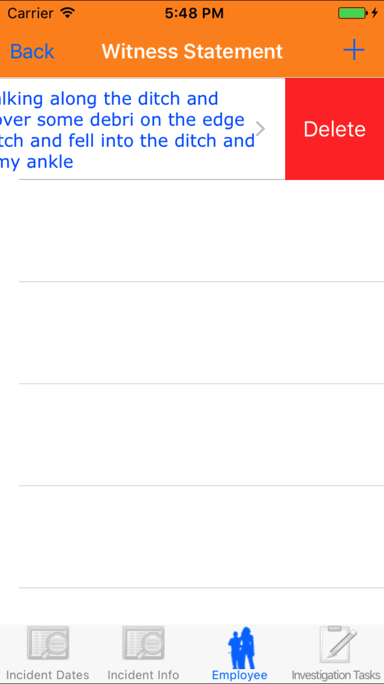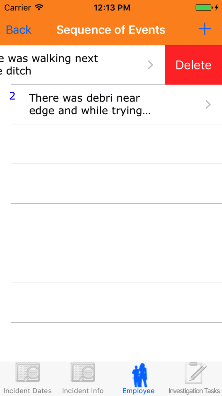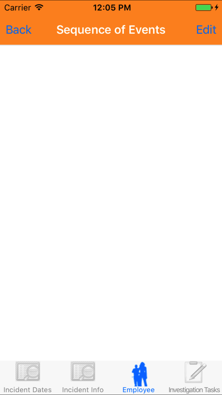 - Tap the Employee icon, the third tab. This opens the list of Employees, Sequence of Events, Witness Statement, Vehicle Involved, and Drawing.