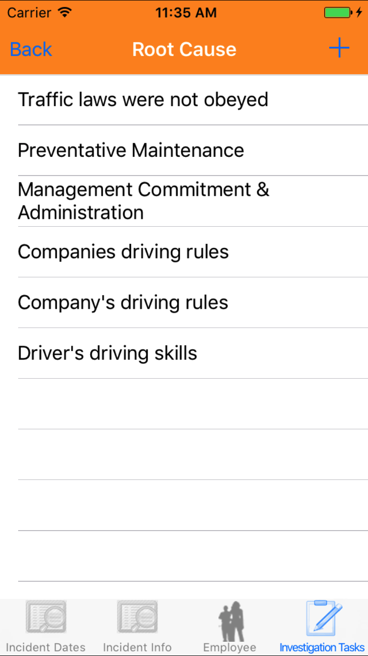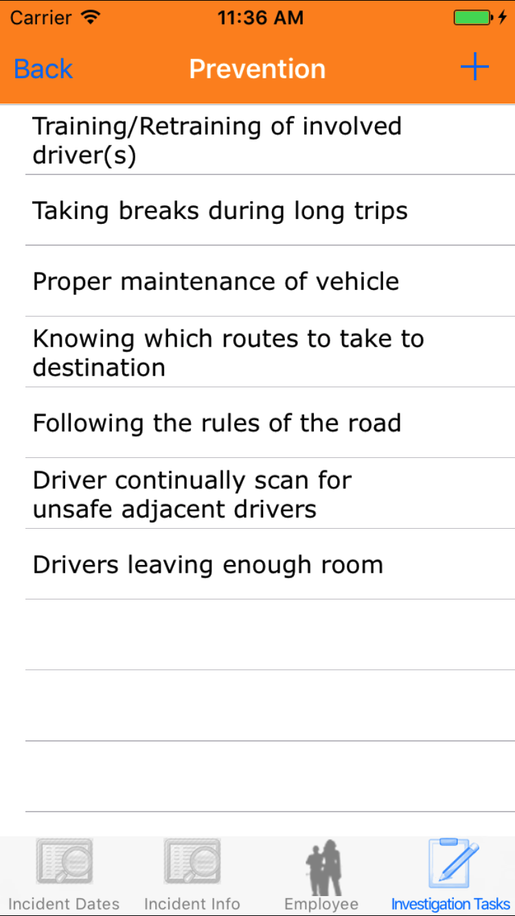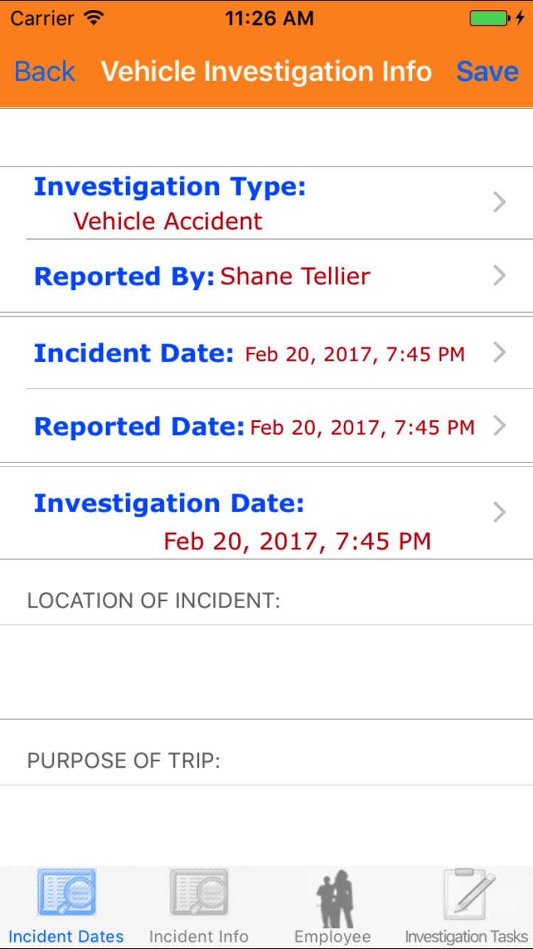 - Tap the desired employee to select it or tap Back in the top left corner to leave the Employee field unchanged and return to the Edit Vehicle Investigation screen.