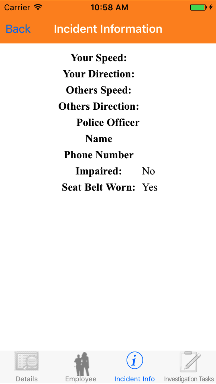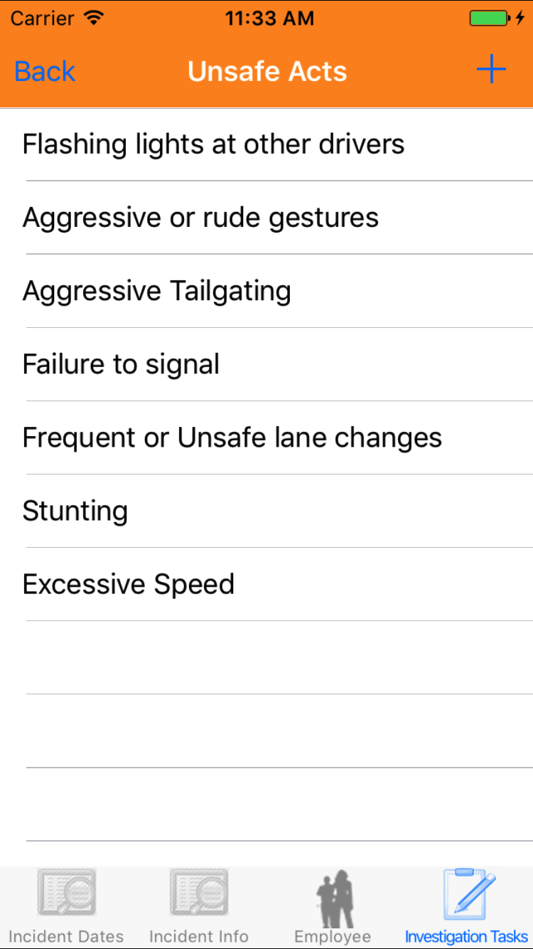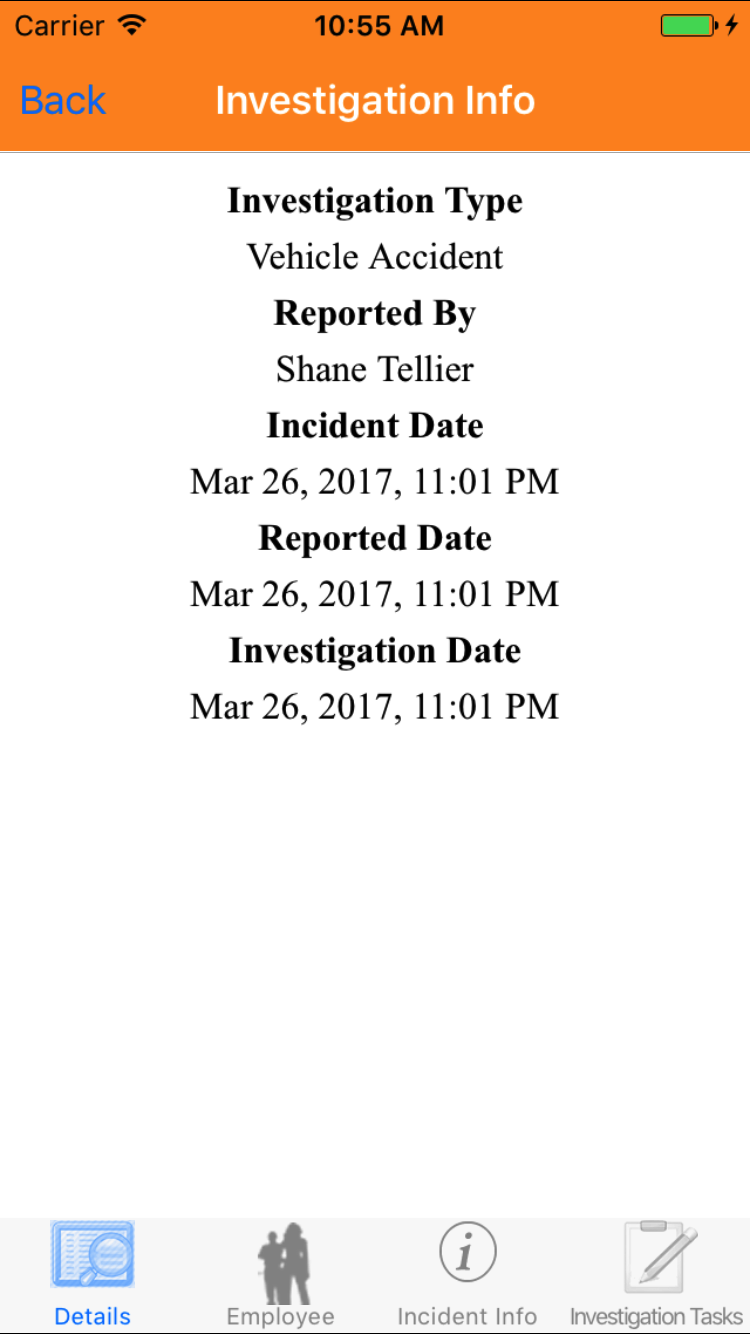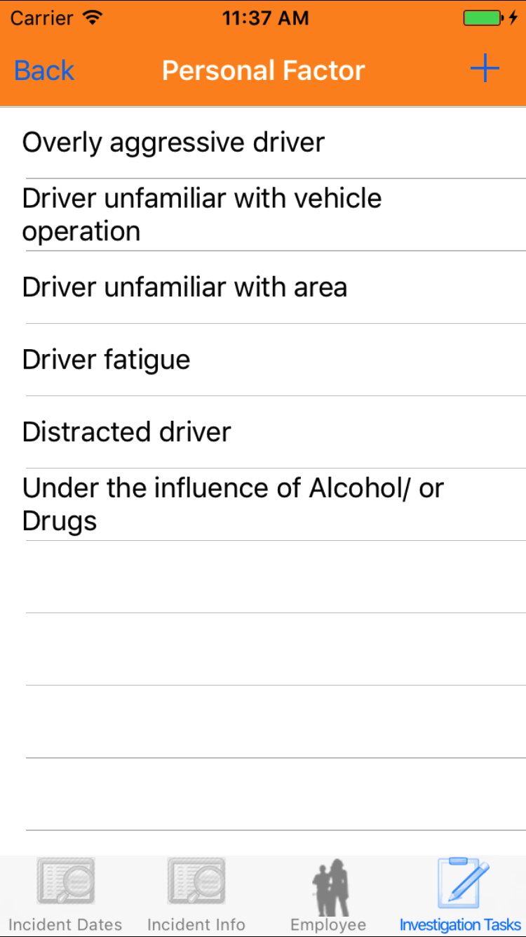 - Tap the desired employee to select it or tap Back in the top left corner to leave the Employee field unchanged and return to the Edit Vehicle Investigation screen.